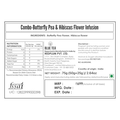 This product is a combo of Butterfly Pea Flower Tea and Hibiscus Tea. It is a delicious treat for your health & taste. This tea can be a delightful stand-alone tea iced or hot or a nice addition to mocktails and other drinks for its fervent natural color. It is a rich source of antioxidants. These are dried in the sun on special bamboo mats to retain all-natural nutrients.