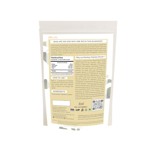 Namhya Foods Triphala Powder is a natural and authentic herbal powder made from a blend of three fruits: Amla Haritaki and Bibhitaki. Triphala Powder is a well-known Ayurvedic formulation that has been used for centuries to promote digestive health detoxify the body and support overall wellness. Namhya Foods Triphala Powder is sourced directly from farmers and is free from preservatives and additives ensuring a pure and authentic product. The powder can be mixed with warm water or milk for consumption or used in skincare and hair care formulations. Namhya Foods Triphala Powder is a safe and effective choice for those seeking a natural health supplement