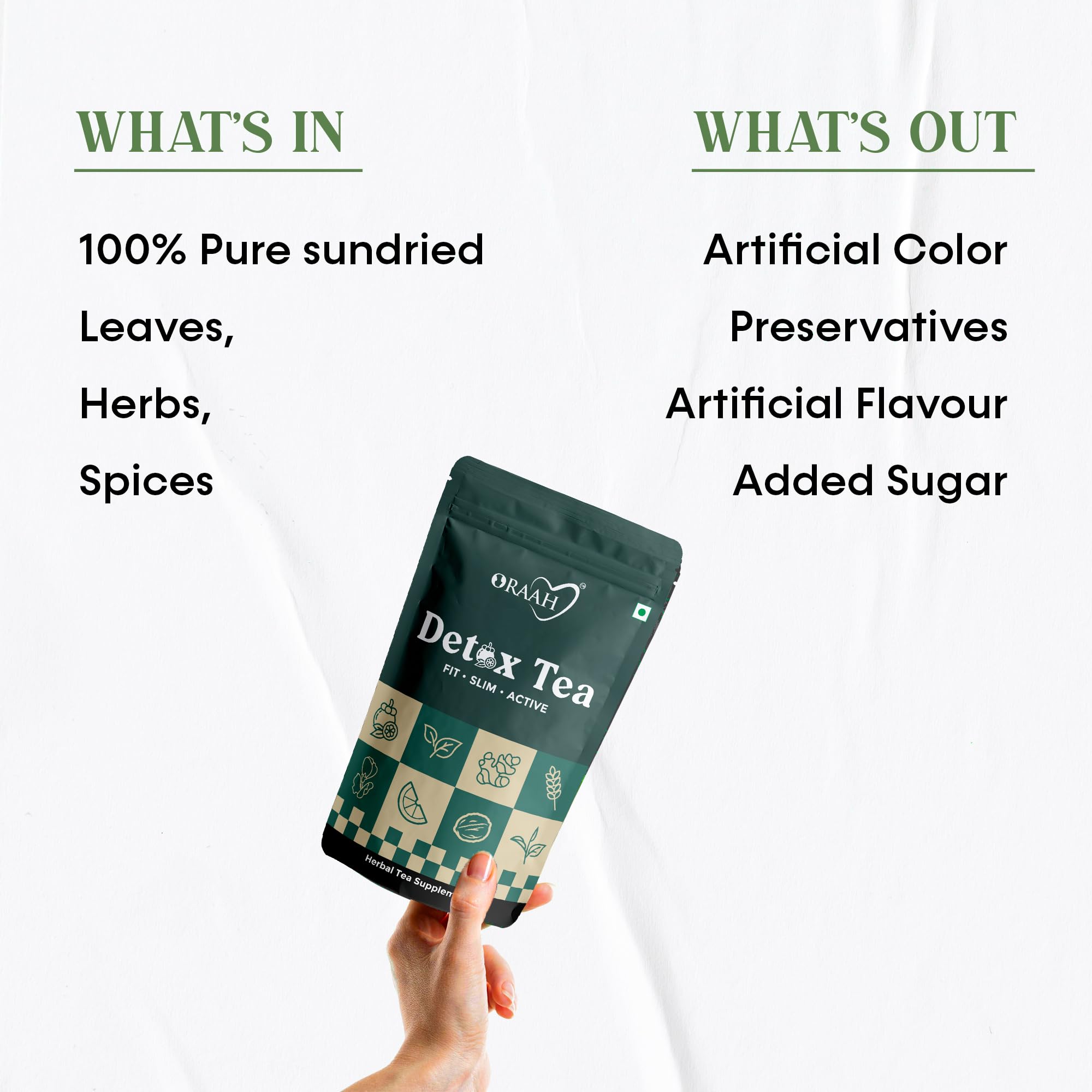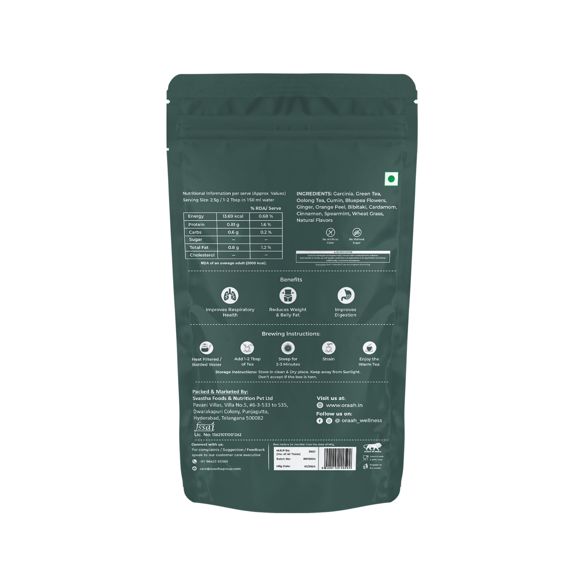 ORAAH Detox Tea is the ultimate solution for weight loss and overall wellness! Our unique blend of Oolong blue pea orange peel Garcinia Cambogia and Ginger with green tea leaves is specifically designed to aid in weight management. our tea is made with only the finest ingredients to ensure the highest quality and effectiveness. Feel refreshed energized and detoxed as you sip this incredible blend. Allergens contain wheat Grass. Precautions; Don't consume if you are pregnant & lactating.