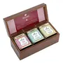 An expertly curated range of loose leaf wellness teas serving versatile brews for detox digestion and calming. This collection of magical elixirs has been touted to have a myriad of health benefits with every tea blend possessing its unique flavor profile and mesmerizing aroma. These loose-leaf tea blends contain nutrient-rich Indian ingredients like turmeric exotic spices flowers etc which have been known for their wellness properties since ancient times. Handcrafted loose teas packed in petite festive tins put together in a beautiful handmade wooden box. This assortment makes for a true Indian masterpiece with every tea having its unique flavor and distinct health benefits.