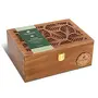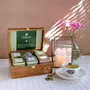 An expertly curated range of five loose leaf wellness teas serving versatile brews for detox digestion calming and immunity boost. This collection of magical elixirs has been touted to have a myriad of health benefits with every tea blend possessing its unique flavor profile and mesmerizing aroma. These loose-leaf tea blends contain nutrient-rich Indian ingredients like turmeric tulsi exotic spices flowers etc which have been known for their wellness properties since ancient times. It is a complete wellness kit with five healthy loose teas and an infuser to brew them thus taking care of your well-being throughout the day. From your first cup of tea in the morning to your evening tea time we've got you covered. Handcrafted loose teas packed in petite festive tins put together in a beautiful handmade wooden box. This assortment makes for a true Indian masterpiece with every tea having its unique flavor and distinct health benefits.