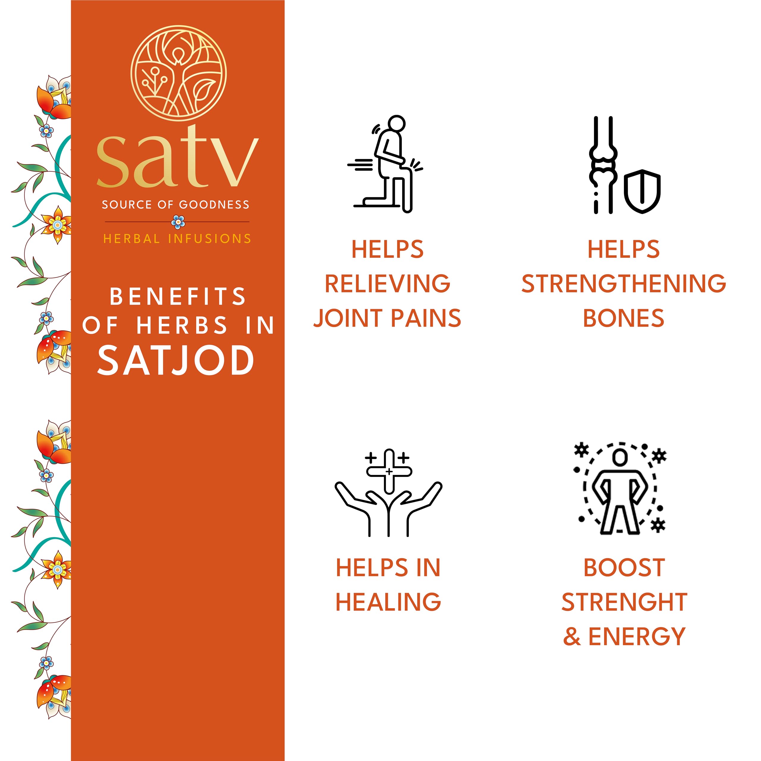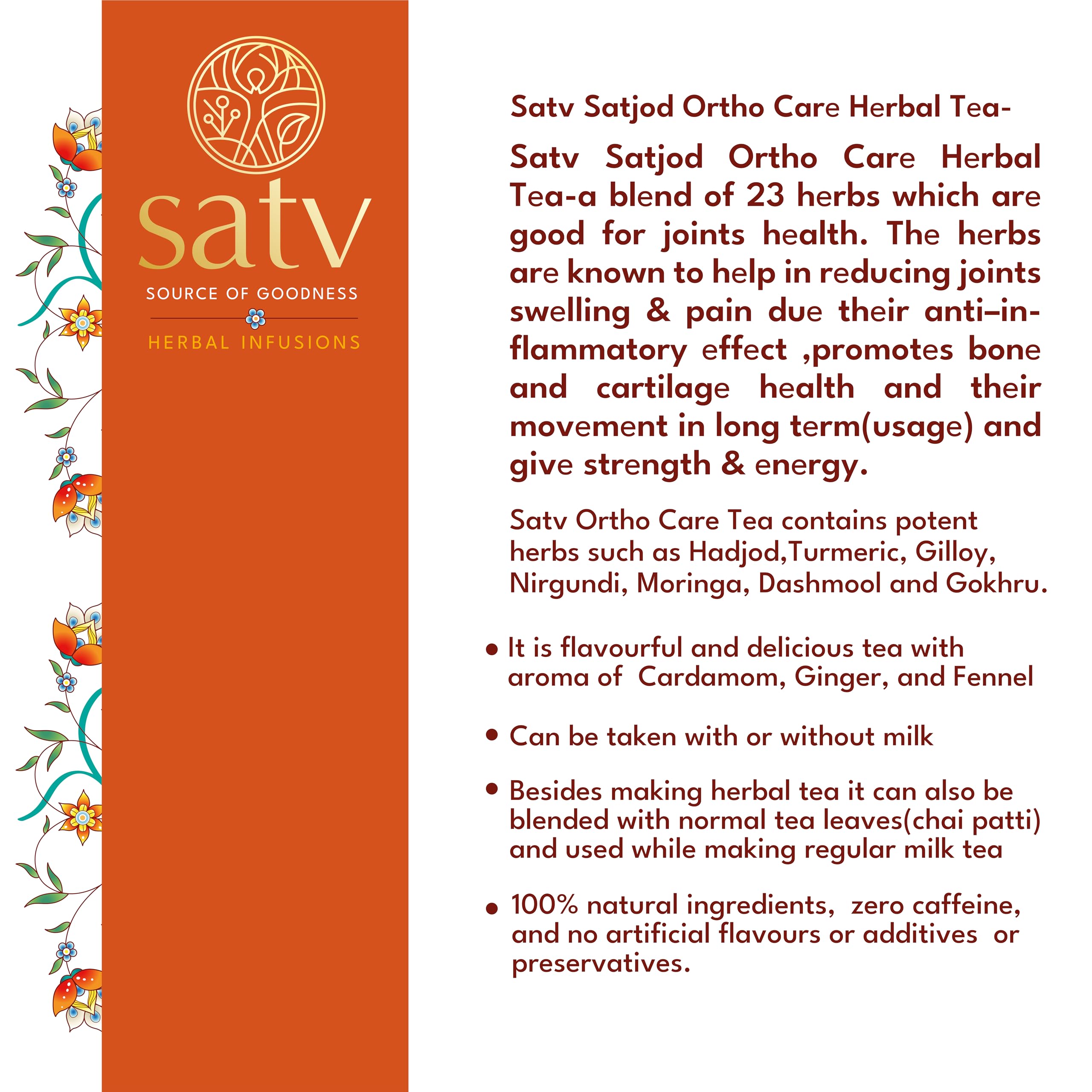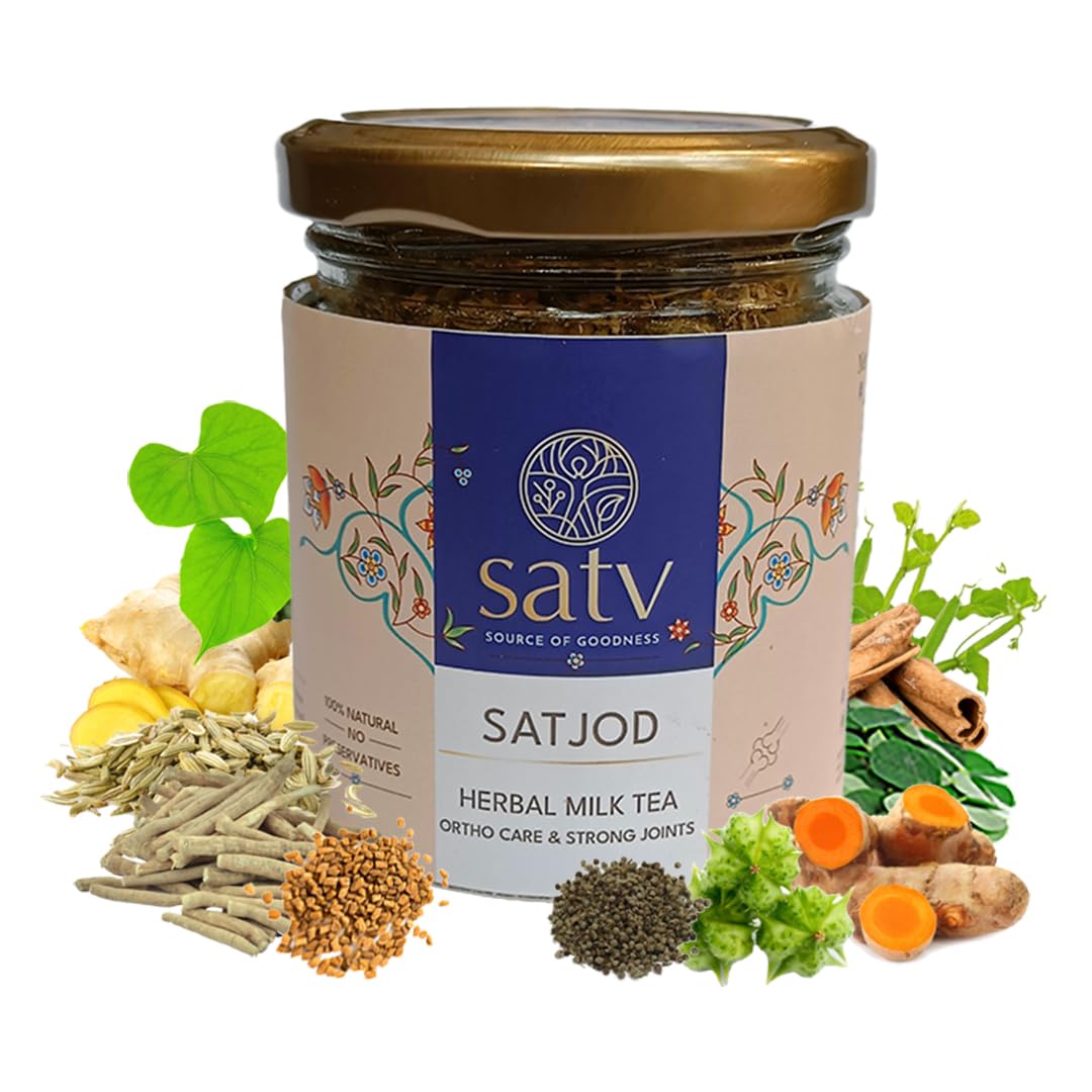 Satv SATJOD Ortho Care Herbal Tea is a blend of 23 herbs which are good for joints health. The herbs are known to help in reducing joints swelling & pain due their anti inflammatory effect promotes bone and cartilage health and their movement in long term (usage) and give strength & energy. Can be taken with or without milk