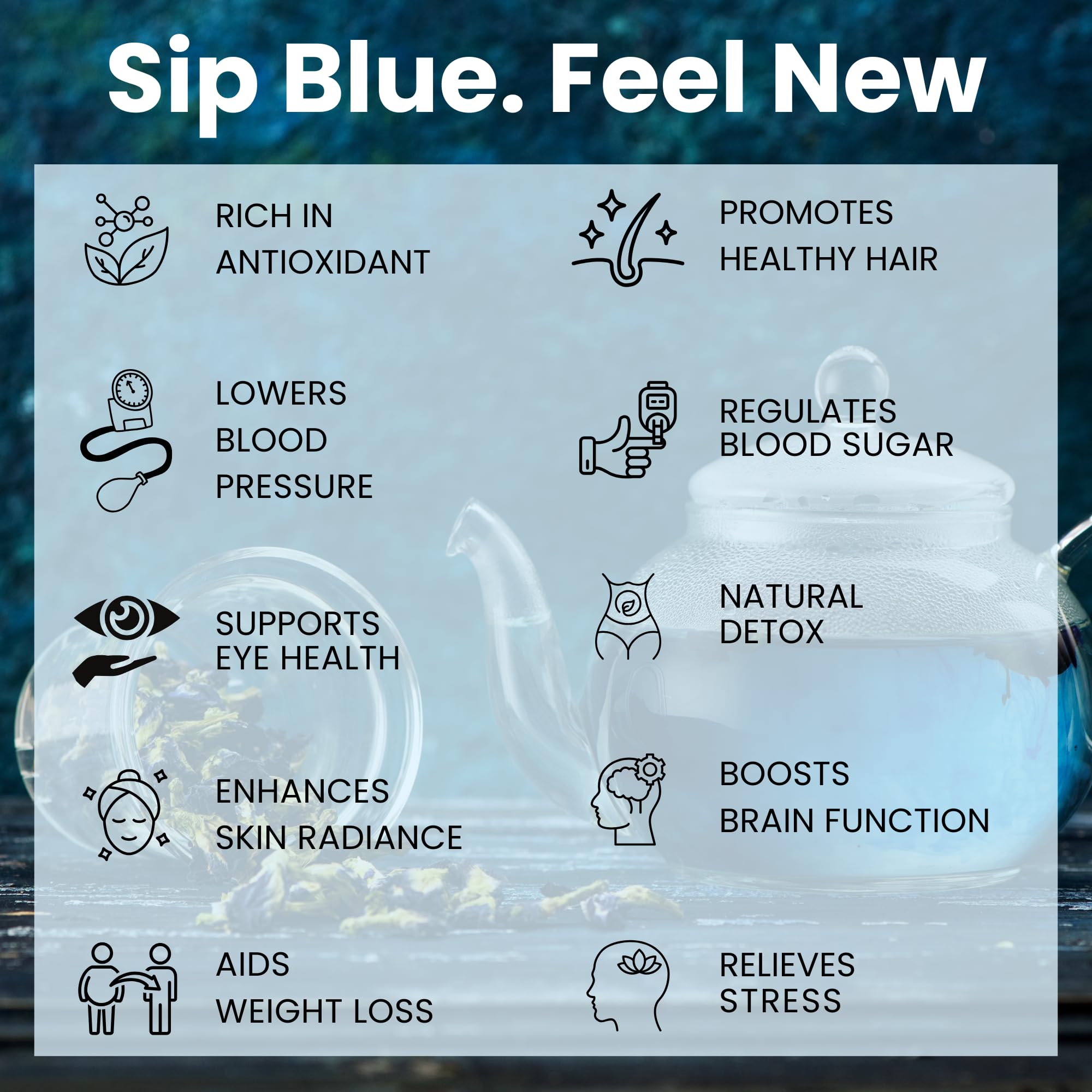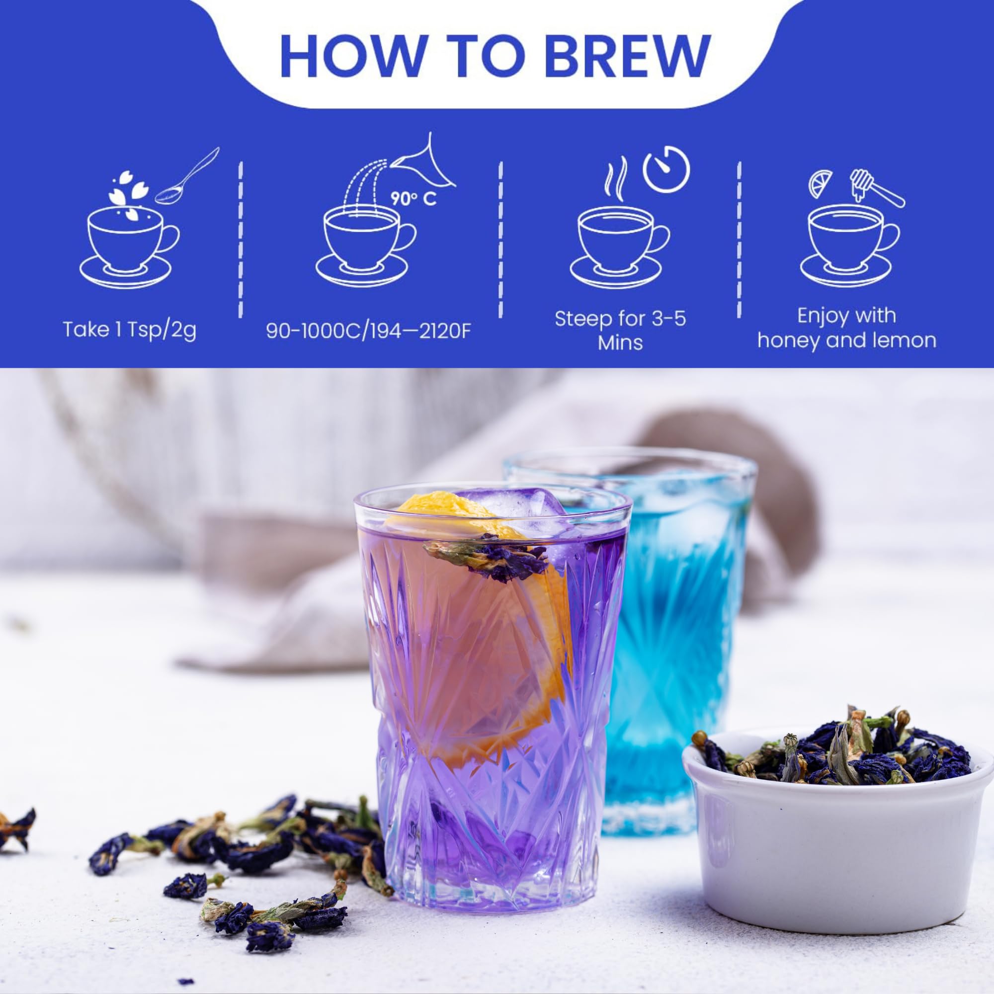 • Versatile Delicious and Caffeine-Free: Enjoy this vibrant blue tea hot or iced any time of the day. Whether you're looking for a cozy winter drink or a refreshing summer treat its delightful flavor and caffeine-free nature fit every occasion.