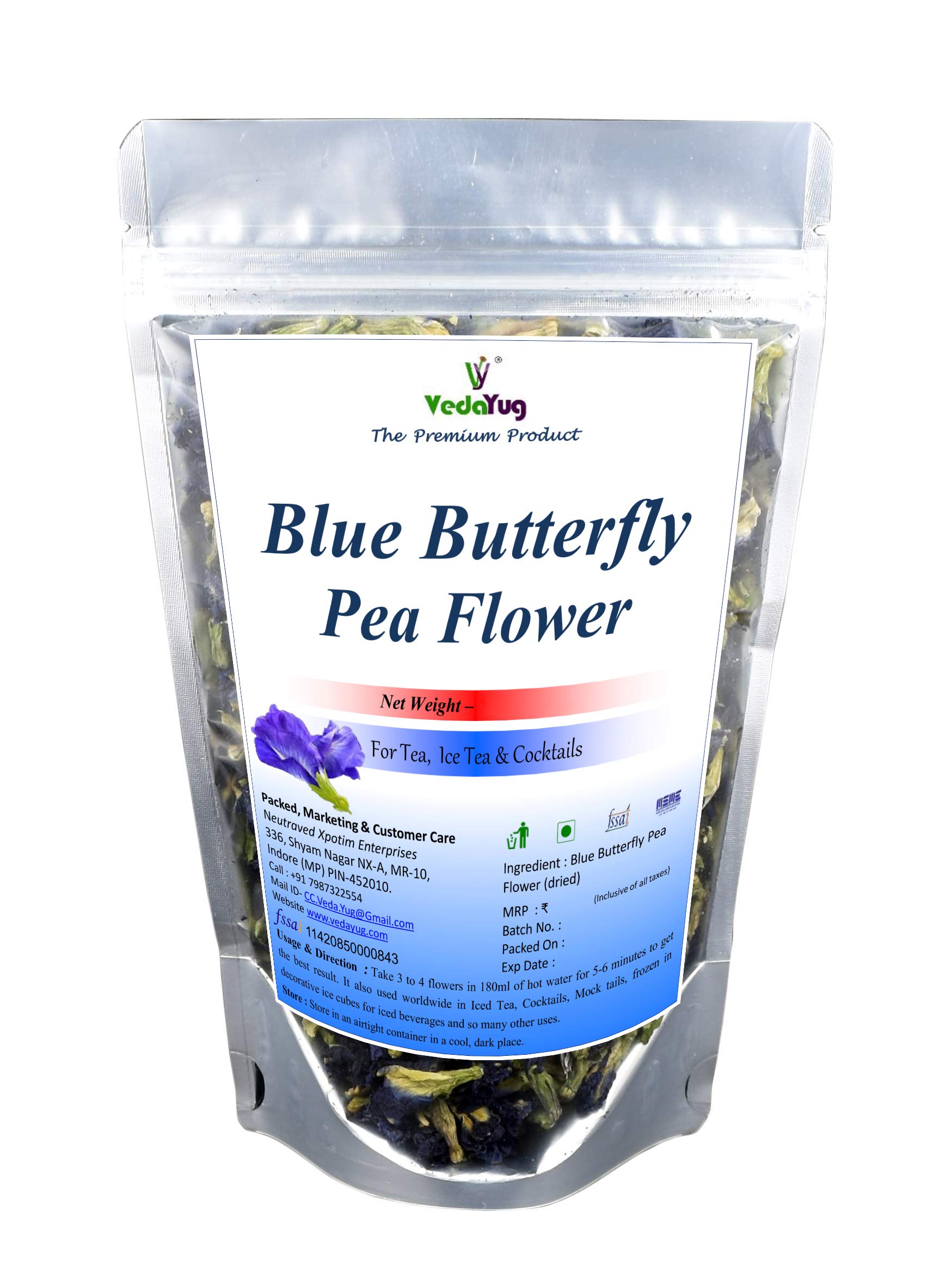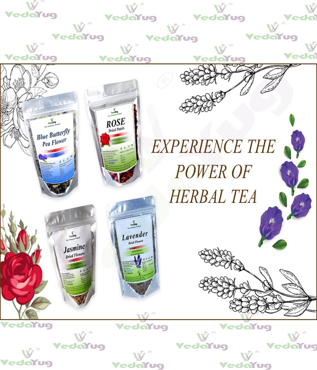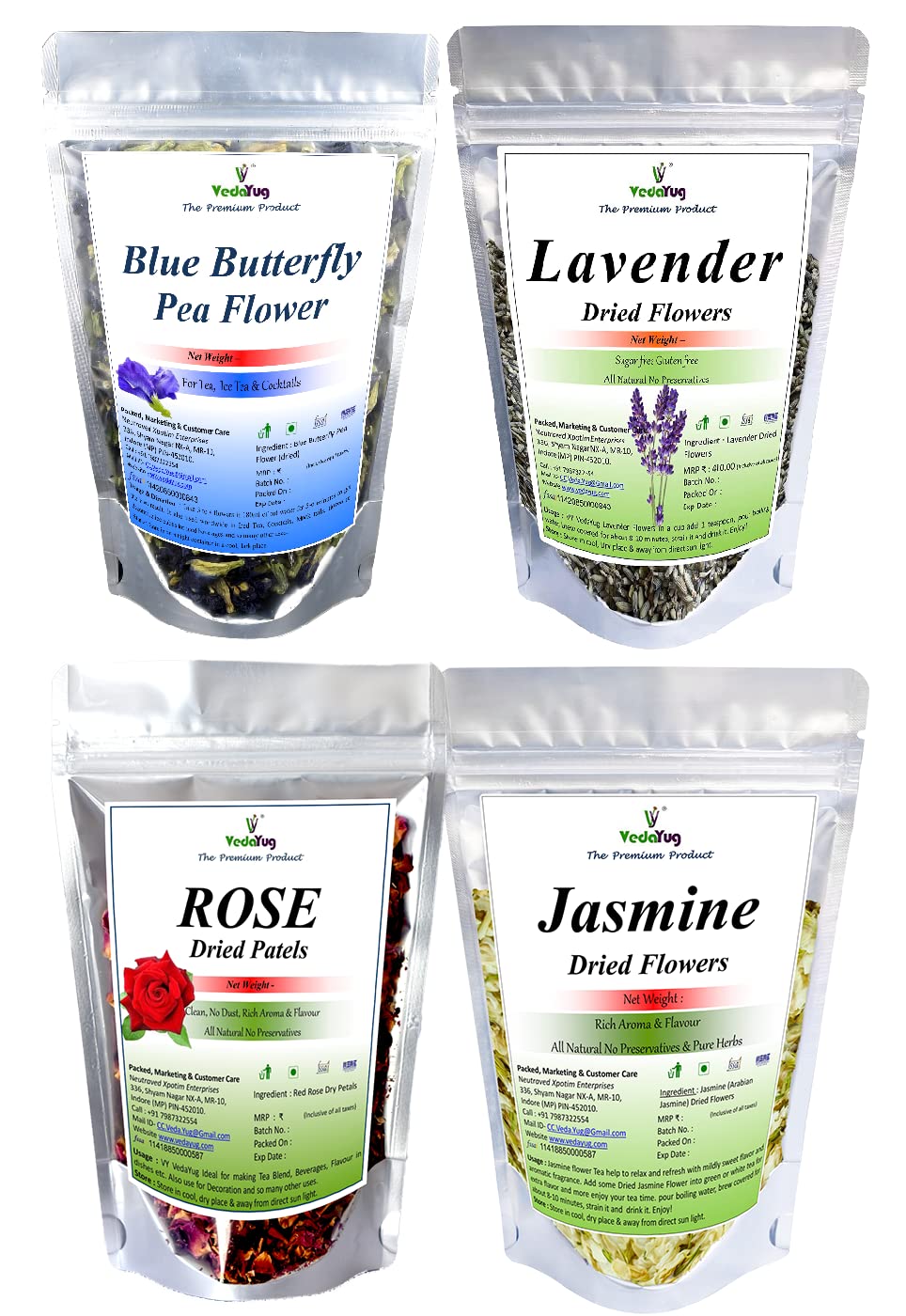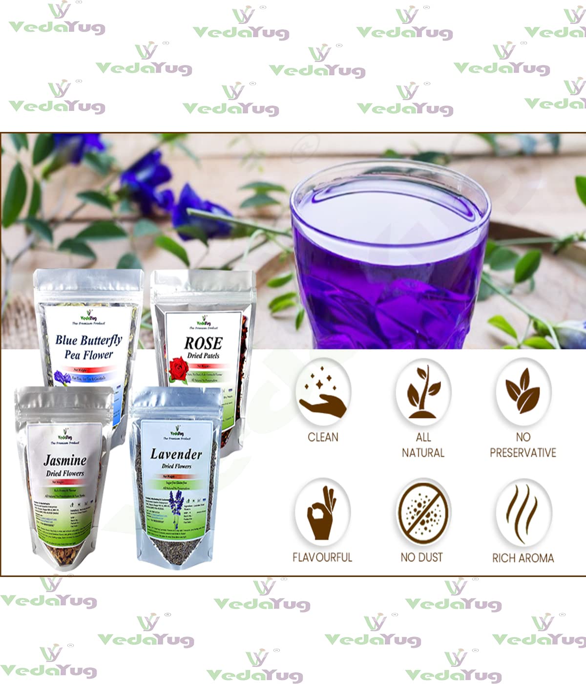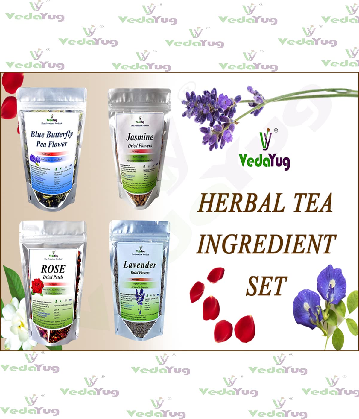 VY VedaYug Blue Butterfly Pea Flower + Rose Petals + Lavender Flowers + Jasmine Dry Flowers Herbal Tea Ingredient Set | Flower Drinks Iced Teas Coolers Cocktails | 95Gm