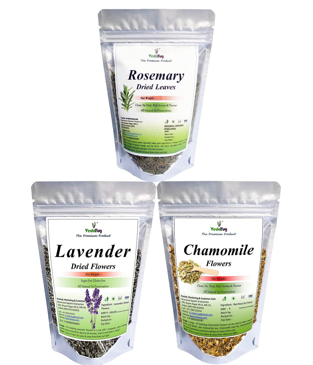 VY VedaYug Combo Herbal Tea | Chamomile Flower Tea 30g Lavender Flower Tea 30g & Rosemary Leaves 50g| Caffeine Free Herbal Tea| Soothing Tea (110g)