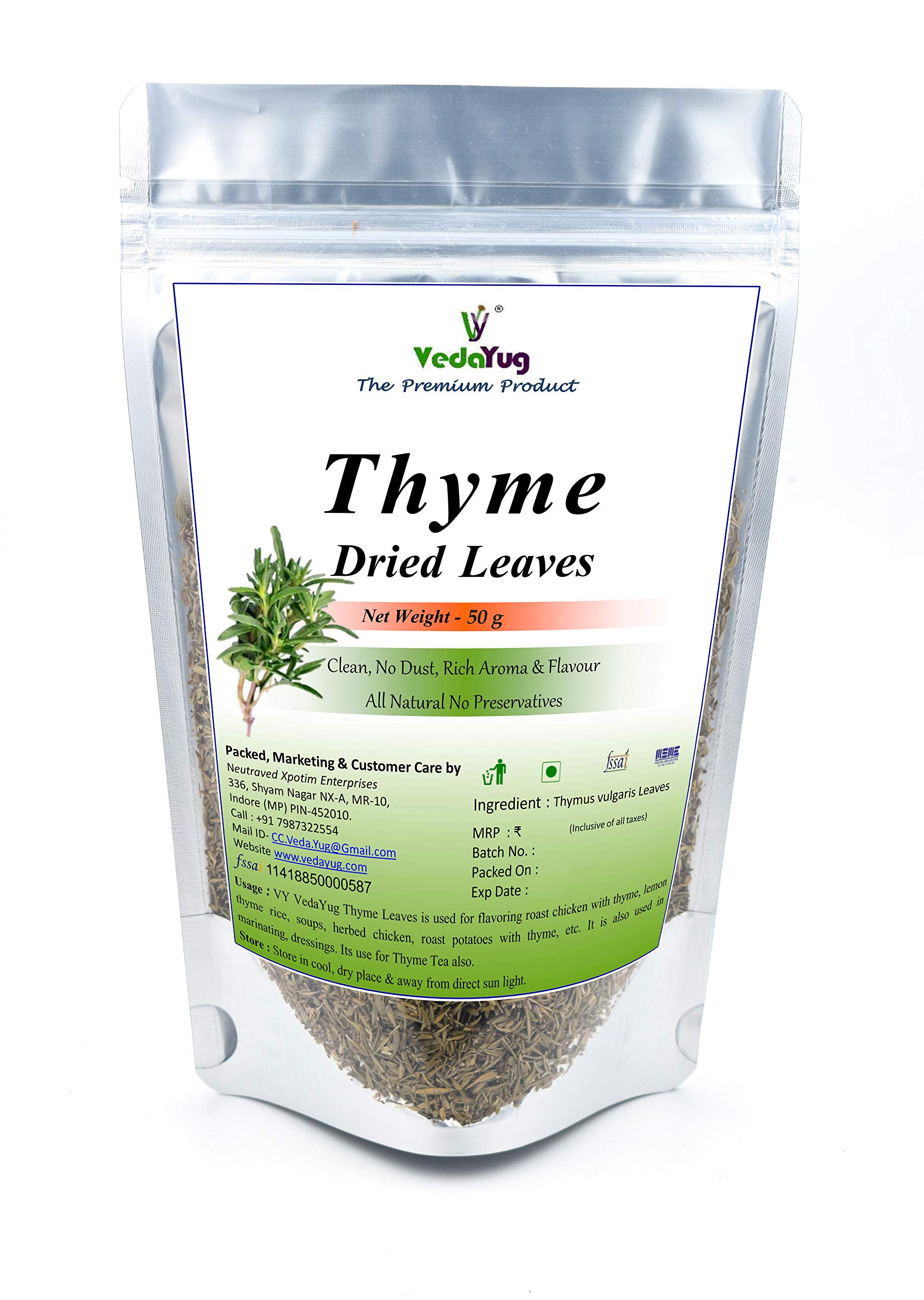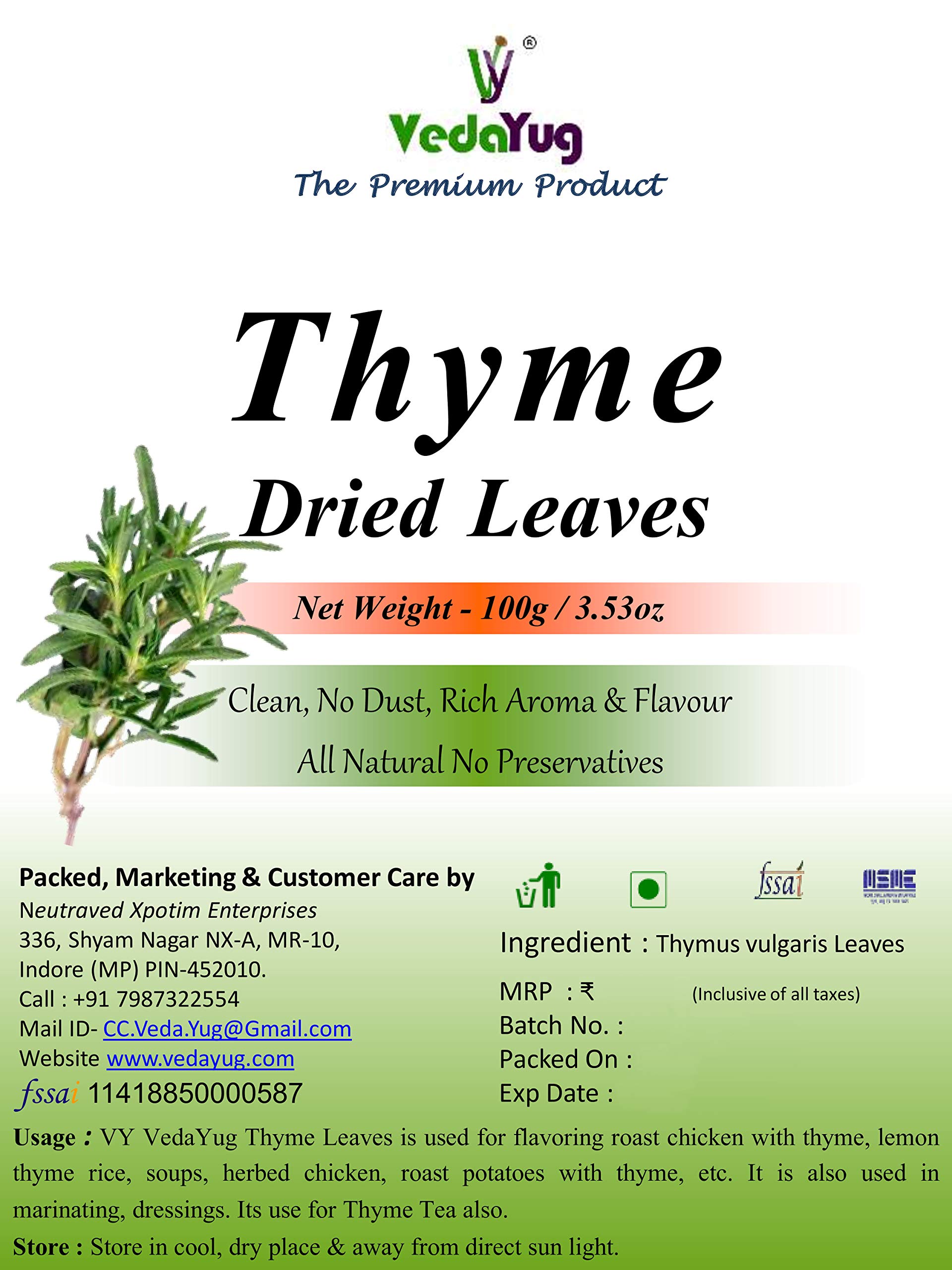 VY VedaYug Thyme leaves 100g for Seasoning Italian Sauces Salad Sandwiches Pizza Healthy Dried Herbs Herbal Tea Leaves for Cough and Cold- 100g