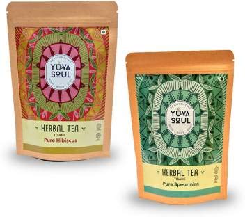 Made from select quality of dried Hibiscus flower petals the Yuva Soul Hibiscus tea is an ultimate health tonic. Hibiscus is a gem of a flower that has been used since ancient times in India to reduce body pitta. In addition to soothing a sore throat the hibiscus infused tea also helps reduce the body temperature. Since ancient times hibiscus tea has also been used to regulate blood pressure and improve heart health. The Yuva Soul Spearmint tea is made from hand-picked fresh Spearmint leaves and provides a delicious minty flavor to the tea. This refreshing blend aids hormonal imbalance and is particularly good for digestive issues as it promotes good gut health. In addition to protecting against infections due to its antibacterial properties the Spearmint tea also helps build a sharper memory.