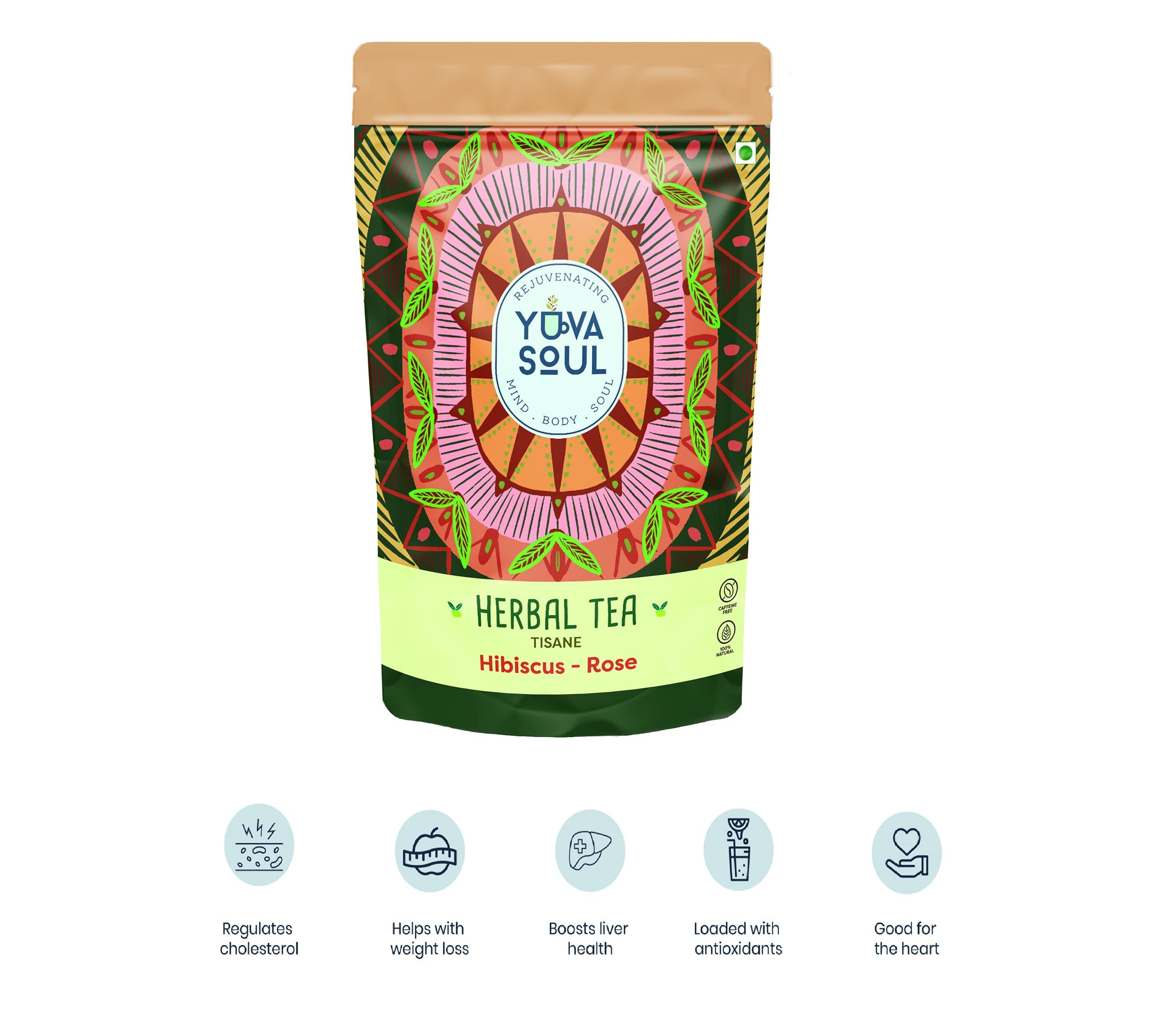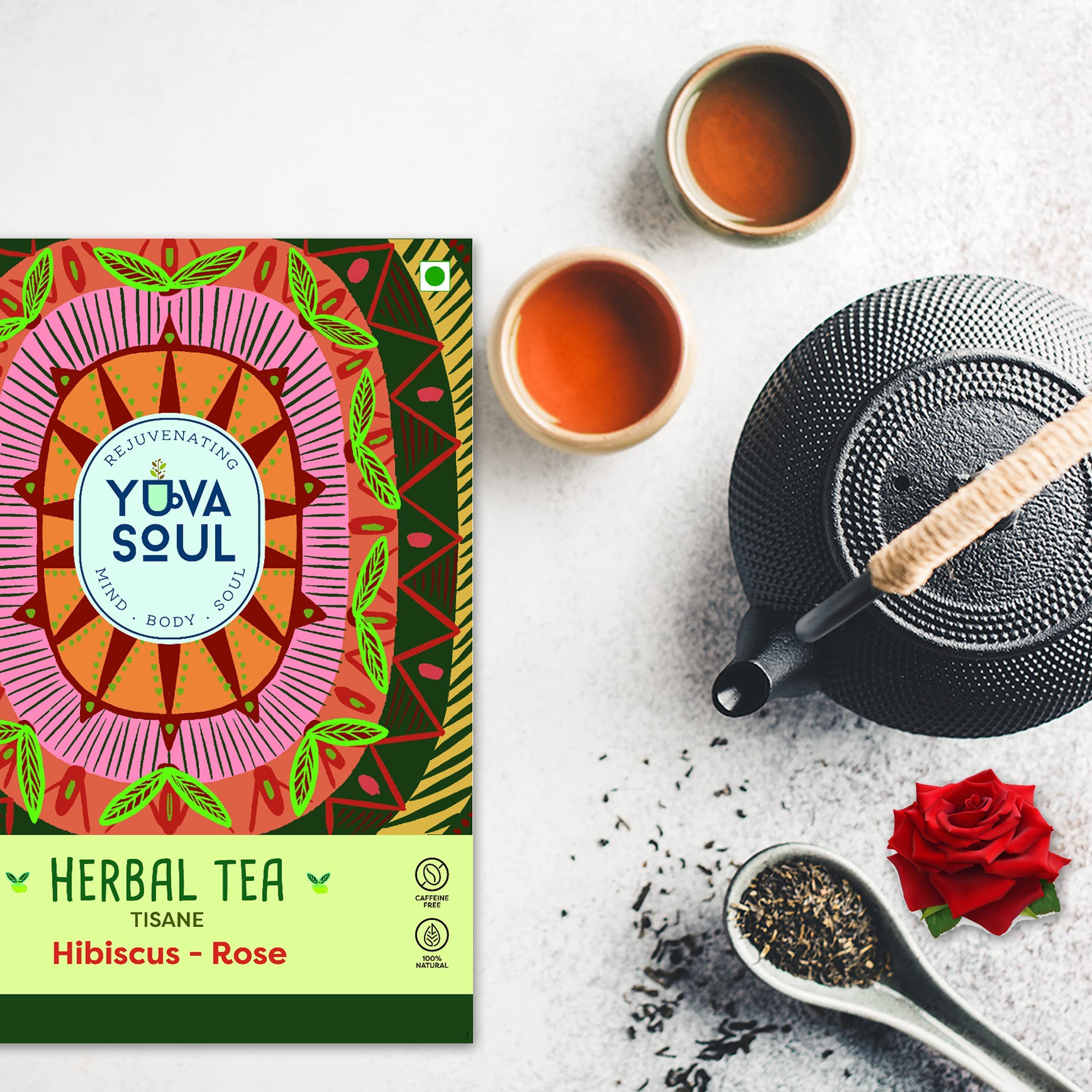 The oxidant rich Hibiscus Rose tea by Yuva Soul is a delicious infusion of dried petals of the hibiscus and the rose flower. The sweetness of the rose and tanginess of the hibiscus gives the tea a deep-red colour. This soothing combination of Rose and Hibiscus is rich in vitamin C that helps the skin detox and also boosts metabolism. Also the flavourful hibiscus-rose tea can be consumed hot or as an iced tea based on ones preference.