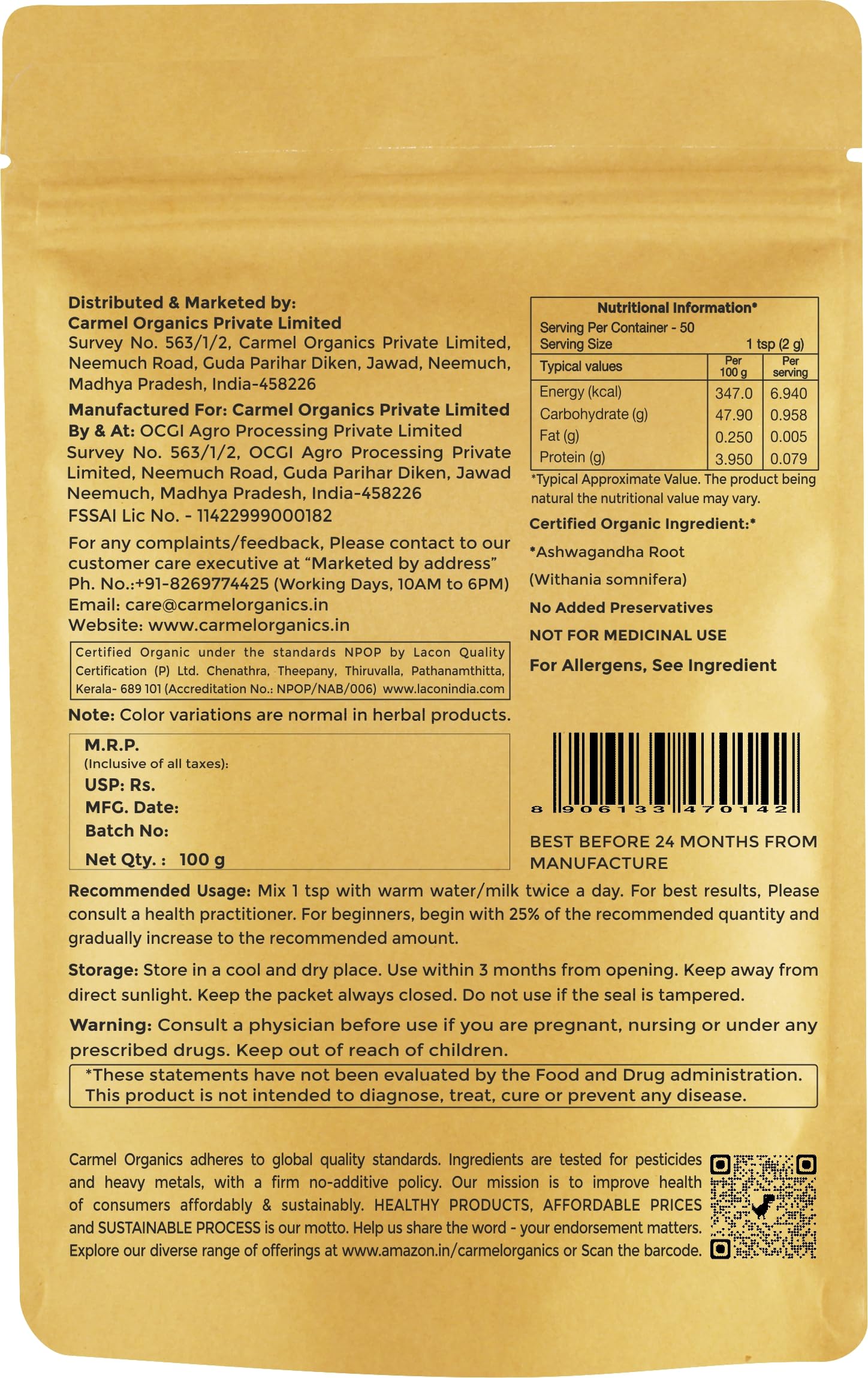 Carmel organics works with more than thousand of small & marginal farmers in India by supporting them with agriculture training, seeds, inputs, guidance & organic certification. By doing this Carmel Organics get certified organic herbs and spices from them in premium prices. Carmel Organics has a certified organic processing unit where we do cleaning, grinding and packing of organic herbs and spices. The facility is situated in central India and is certified by global quality standards of organic & food. Carmel Organics offers premium quality organic products and we ensure the quality of the products from the farm itself as by educating farmers about the right handling procedures. We work with world's leading third party laboratory for ensuring the MRLs compliances in our products.
