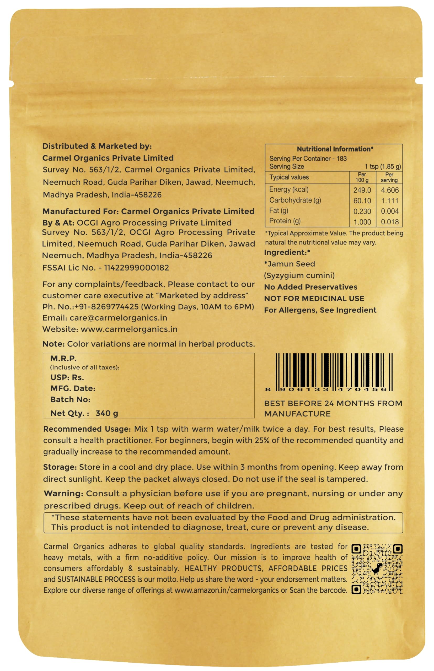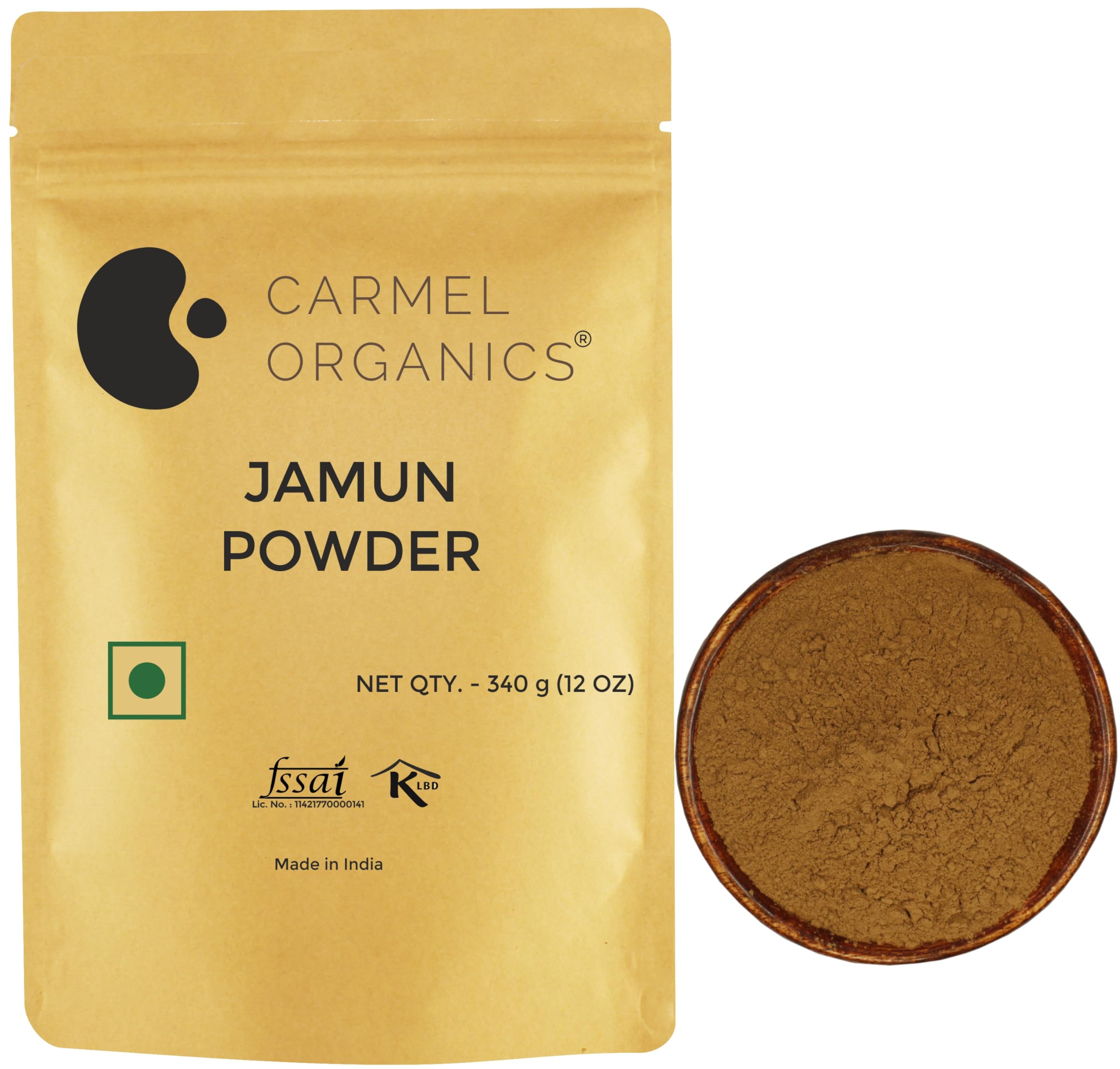 CARMEL ORGANICS Jamun Seed Powder (340 Grams)(Pack of 1) | Natural | No Added Preservatives | Naaval Pazham Vitaippu Maavu | Syzygium Cumini | Help to Regulate Blood Sugar Levels