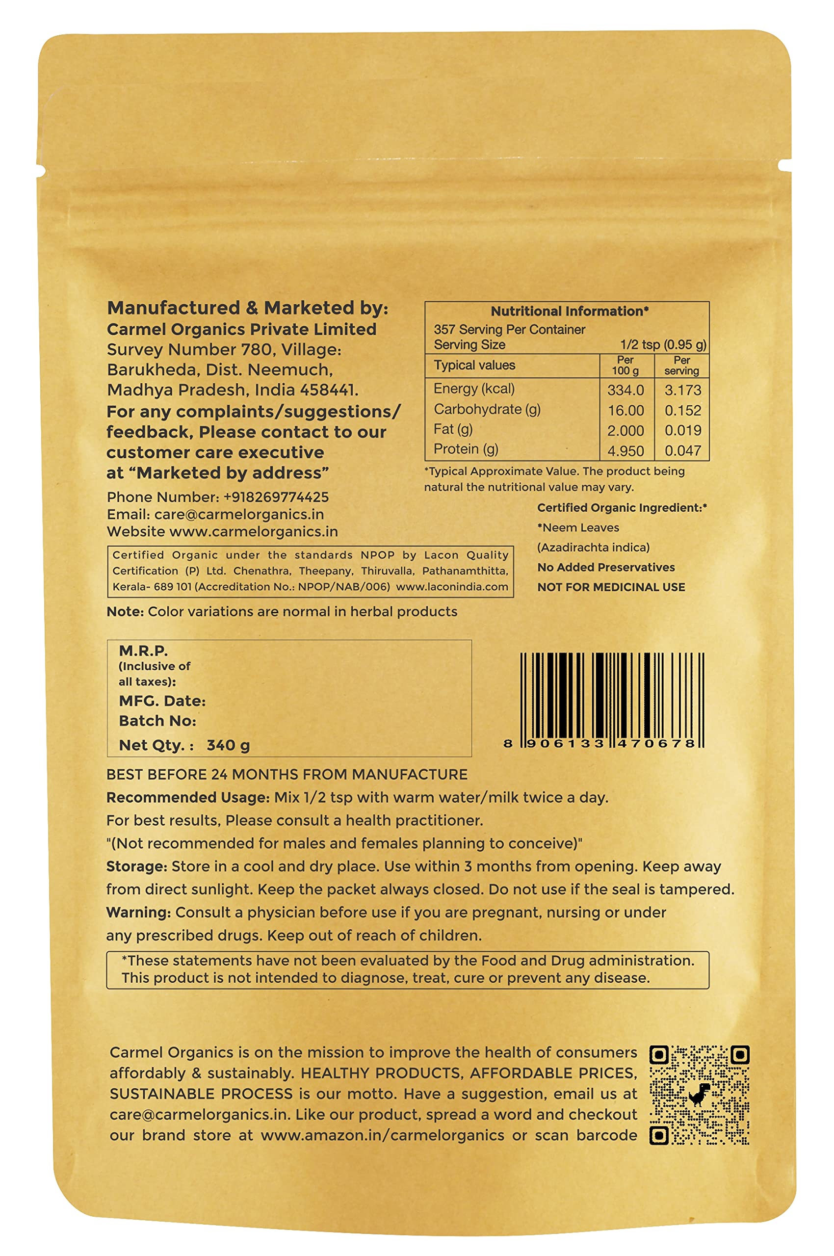 CARMEL ORGANICS Neem Leaves Powder (340 Grams)(Pack of 1) | Jaivik Bharat Certified | Azadirachta Indica | Vembu Powder/Veppa Powder | Non-GMO | No Added Preservatives