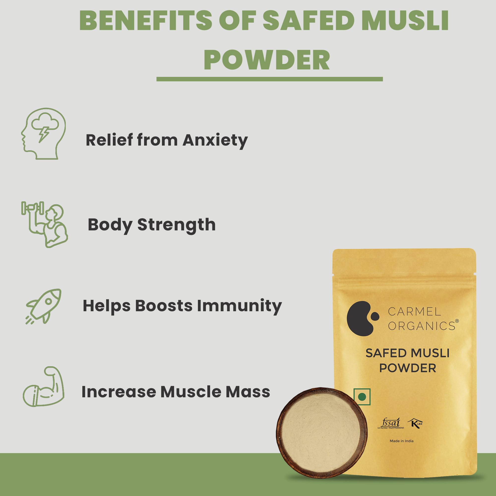 CARMEL ORGANICS Safed Musli Root Powder 100 Grams | Natural | Non-GMO | Siva Musli Podi/Shweta Musli Hudi | Chlorophytum Borivilianum | No Added Preservatives