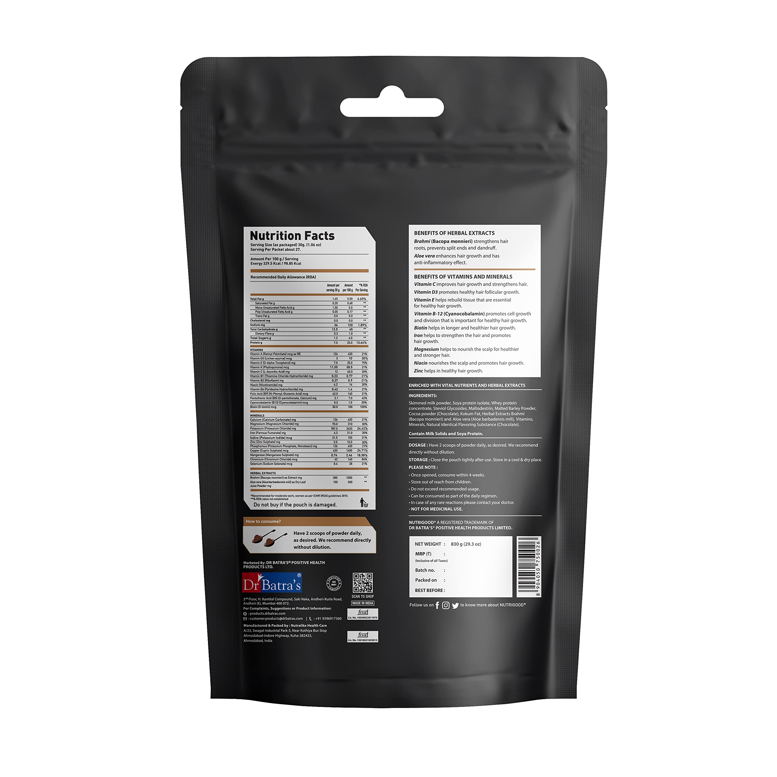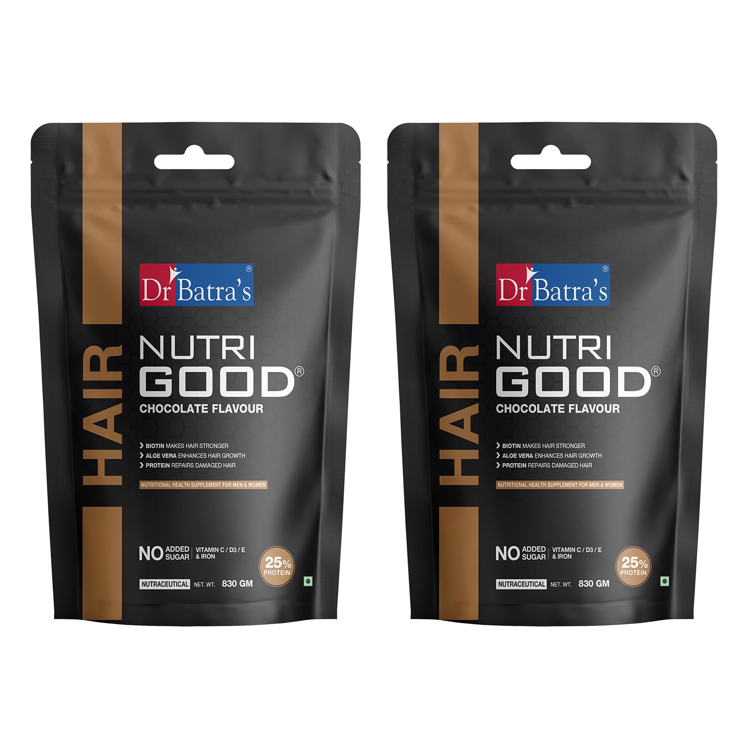 Dr Batra's range of Nutrigood comes in a delicious chocolate flavor you cannot resist. What's more it is a plant-based protein devoid of chemic. Power-packed with vitamins for hair growth it is a hair supplement for brittle dry and lumpy hair. It consists of natural ingredients that are a powerhouse of anti; Brahmi or Bacopa Monnieri Powder and Aloe Vera so now you don't have to worry about the stubborn flaking of the scalp that refuses to go away. This hair supplement o consists of Vitamin E Vitamin B12 Vitamin A and Vitamin C making it one of the best supplements for hair growth and thickness.