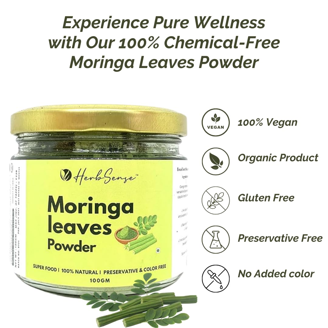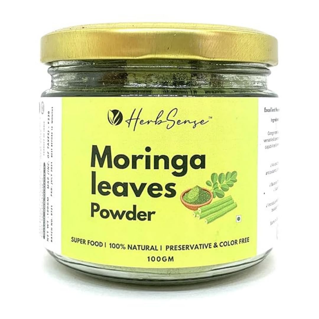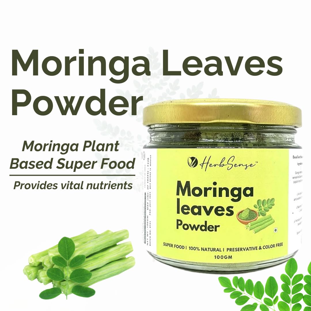 Herbsense Moringa Leaf Powder : Excellent Nourishing Therapeutic Grade Superfood. Categorized as a superfood the green is versatile & can be used as a part of daily diet to enhance body's capabilities & energize from within. We call it our "HAPESS Superfood". DAILY DOSE OF NUTRITION : Introduce into your diet by taking ½ to 1 teaspoon per day in a glass of lukewarm water.Honey to taste. PLANT BASED : Moringa is a highly nutritious leafy green superfood rich in anticalcium iron fiber vitamins & plant protein. Moringa trees grow naturally in the tropics with edible leaves & are among the most nutritious plants. COOKING IDEAS :to smoothies oatmeal & yogurt it to sauces soups even baked goods to extra vegetables & nutrition to your diet. 17 times more calcium than that of milk 25 times more iron than that of Sach A rich source of Vitamin C An excellent source of Amino acids (Amino acids form proteins) overall energy level.protein powder Increases stamina & vitality Naturally restores essential vitamin & mineral imbalances
