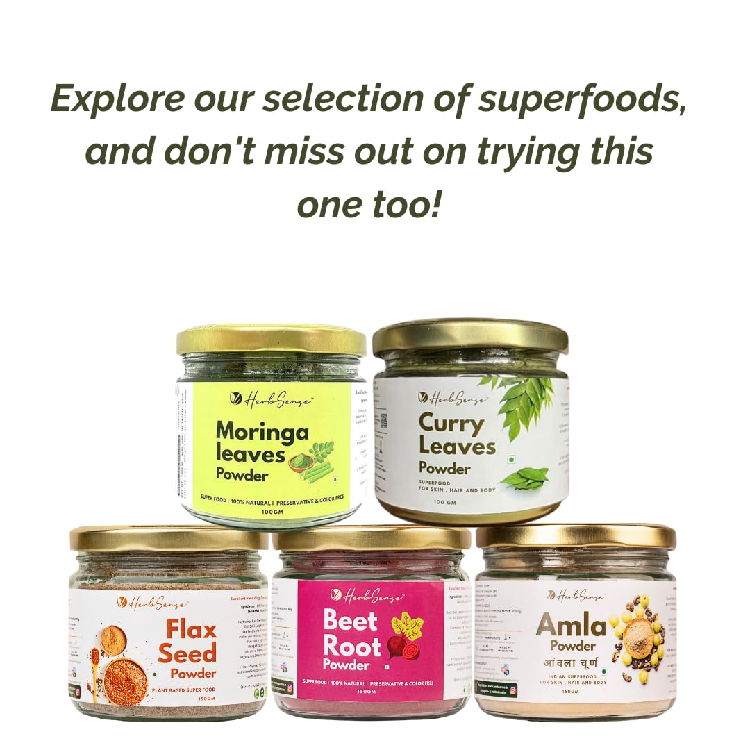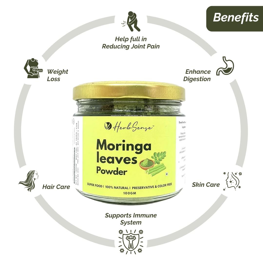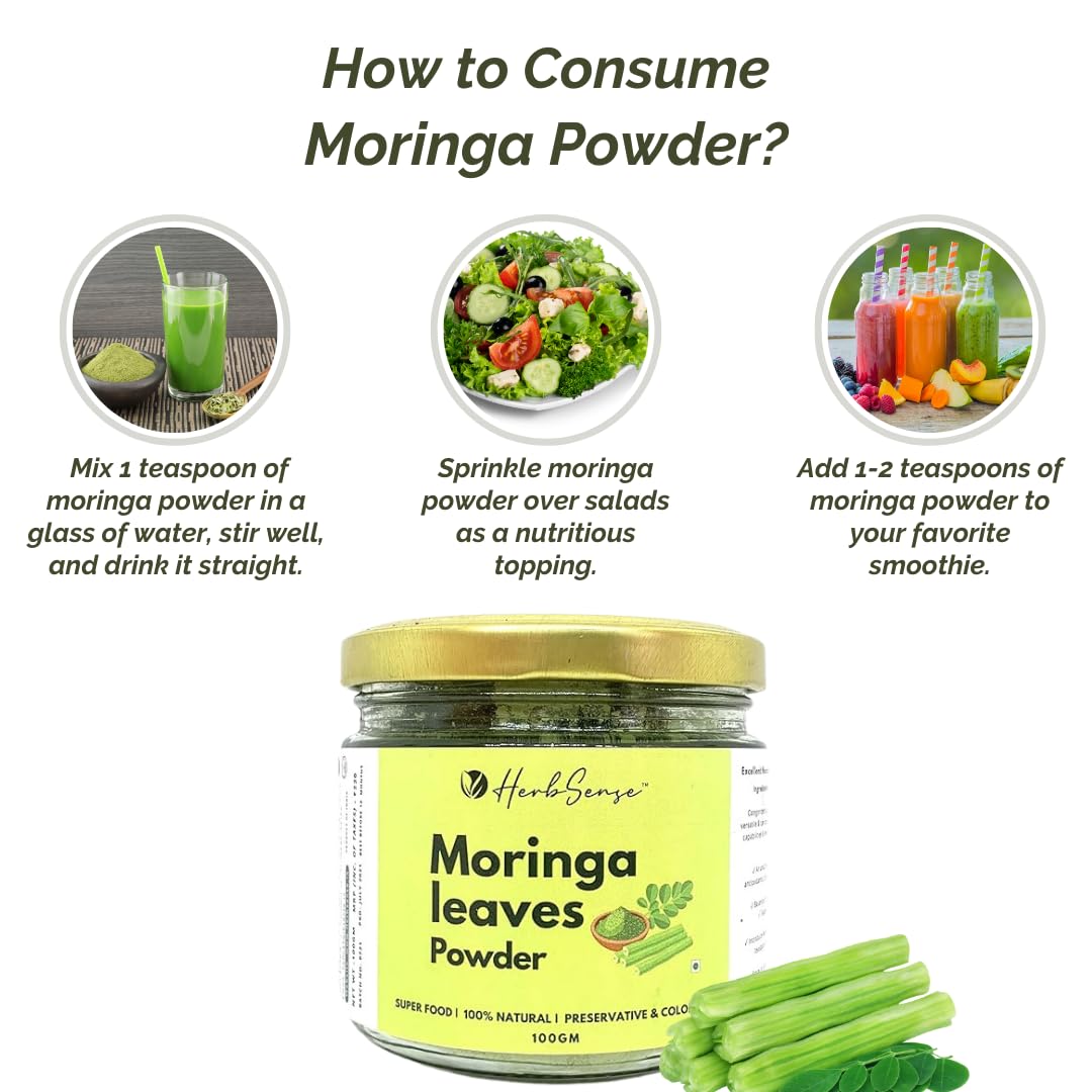 Herbsense Moringa Leaf Powder : Excellent Nourishing Therapeutic Grade Superfood. Categorized as a superfood the green is versatile & can be used as a part of daily diet to enhance body's capabilities & energize from within. We call it our "HAPESS Superfood". DAILY DOSE OF NUTRITION : Introduce into your diet by taking ½ to 1 teaspoon per day in a glass of lukewarm water.Honey to taste. PLANT BASED : Moringa is a highly nutritious leafy green superfood rich in anticalcium iron fiber vitamins & plant protein. Moringa trees grow naturally in the tropics with edible leaves & are among the most nutritious plants. COOKING IDEAS :to smoothies oatmeal & yogurt it to sauces soups even baked goods to extra vegetables & nutrition to your diet. 17 times more calcium than that of milk 25 times more iron than that of Sach A rich source of Vitamin C An excellent source of Amino acids (Amino acids form proteins) overall energy level.protein powder Increases stamina & vitality Naturally restores essential vitamin & mineral imbalances