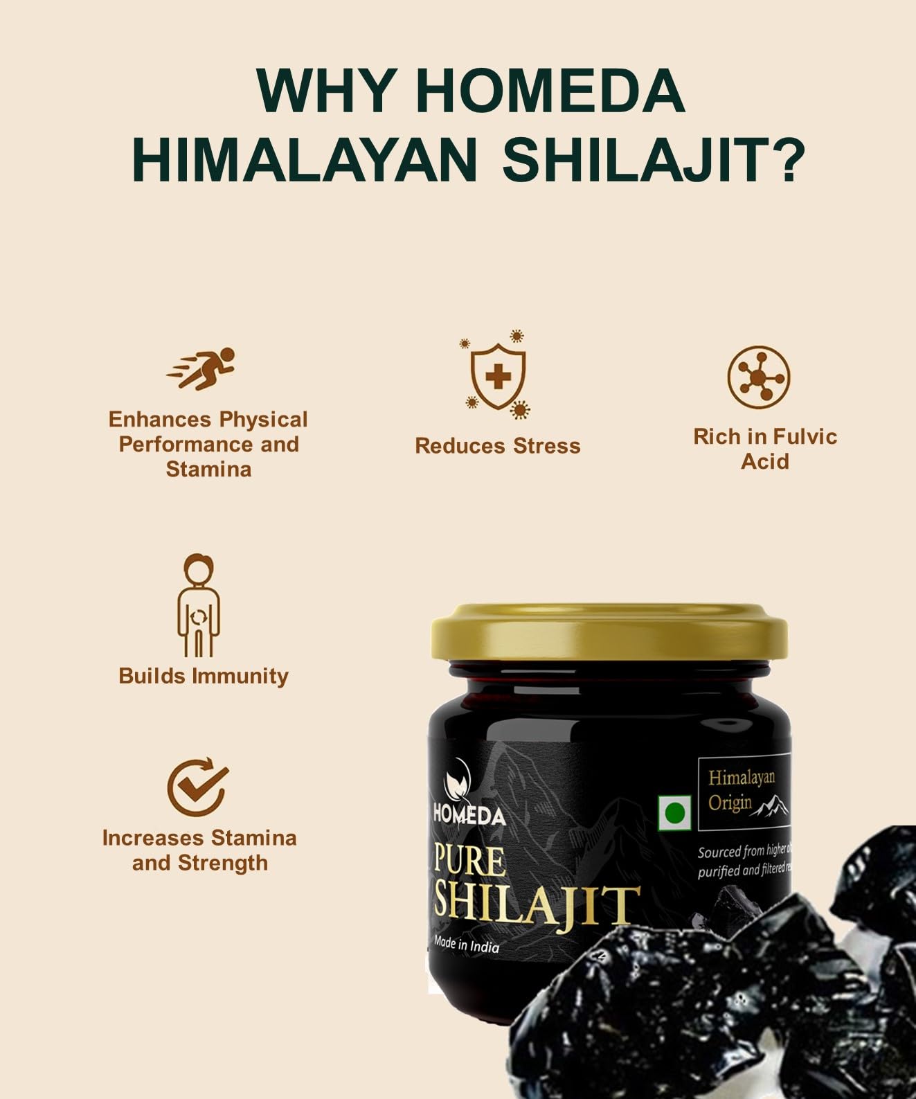 • ORGANICALLY SOURCED FROM THE HIMALAYAS - Homeda Pure Ayurvedic Himalayan Shilajit Resin 20g is organically sourced from high altitudes of Himalayas (~20000 ft) making Sheela Jith original for men (shelaget) rich source of 80+ minerals