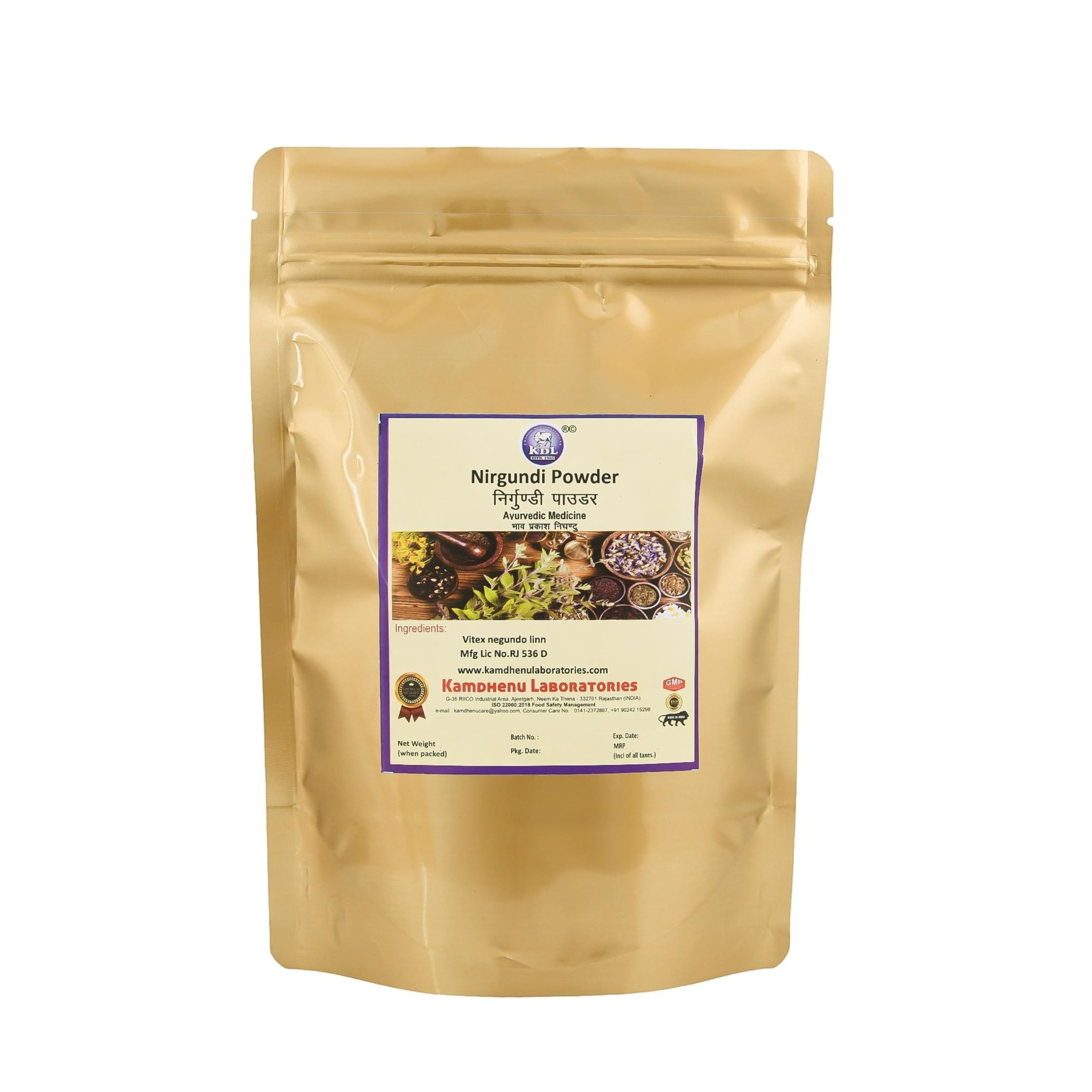 Nirgundi powder helps to reduce the generalized pains of body it helps to reduce the swelling and pains of joints. Helps in digestion of âamaâ (undigested food). Due to its warm potency it helps to increase the menstrual flow in those who have scanty periods (menstural flow). Helps to control the discharge through ears. Helps to provide healthy eye sight. Helps to reduce the generalized pains of body. Helps in stimulating the liver for its healthy secretions.