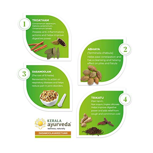 A formulation in Lehyam form Dasamoolahareethaki is beneficial in chronic inflammatory conditions associated with swelling. The intake of this medicine aids relief from fever rheumatoid arthritis bleeding disorders urinary infection anemia and liver disorders. The nourishing ingredients in Dasamoolahareethaki helps gain body weight and hence beneficial in emaciation. It also supports healthy bowel movements and helps promote appetite.