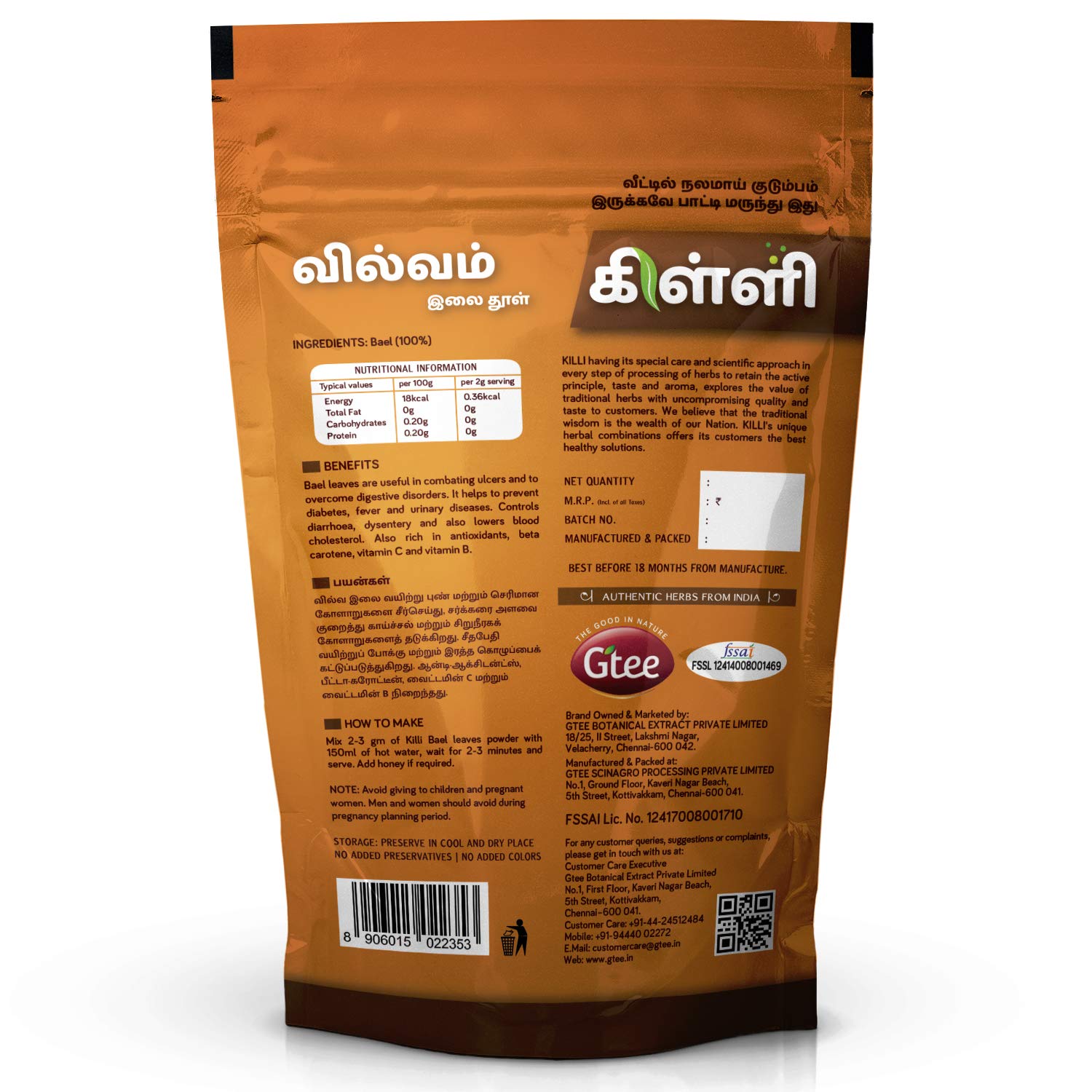 KILLI BAEL LEAVES POWDERHEALTH BENEFITSBael leaves are useful in combating stomach issues and to overcome digestive issues. Also rich in antioxidants beta carotene vitamin C and vitamin B.HOW TO MAKEMix 2-3 gm of Killi Bael leaves powder with 150ml of hot water wait for 2-3 minutes and serve. Add honey if required.KILLI HERBS & SPICESKILLI having its special care and scientific approach in every stop of processing of herbs to retain the active principle taste and aroma explores the value of traditional herbs with uncompromising quality and taste to customers. We believe that the traditional wisdom is the wealth of our Nation. KILLI's unique herbal combinations offers its customers the best healthy solutions. KILLI is a Registered Trademark of Gtee