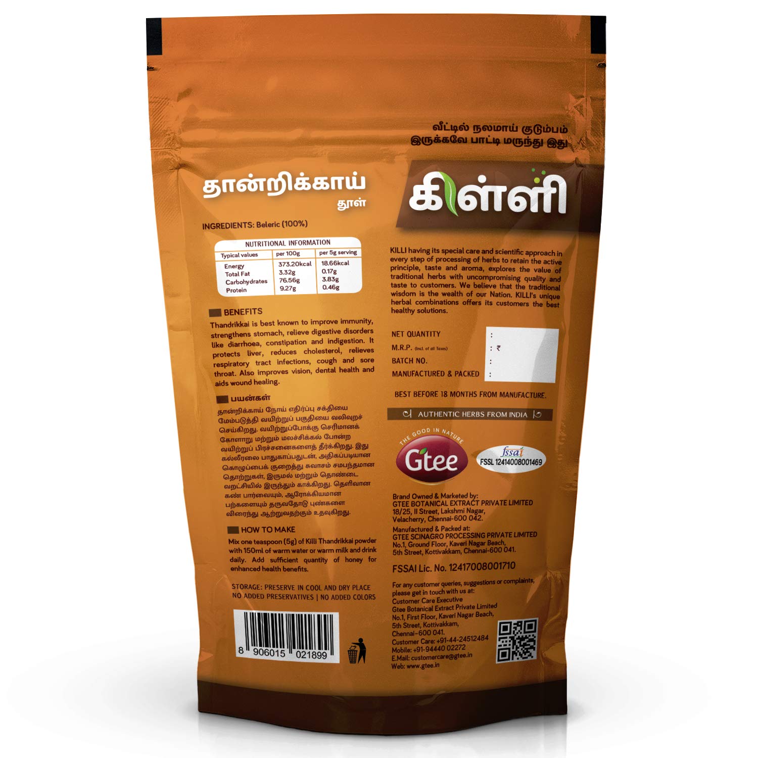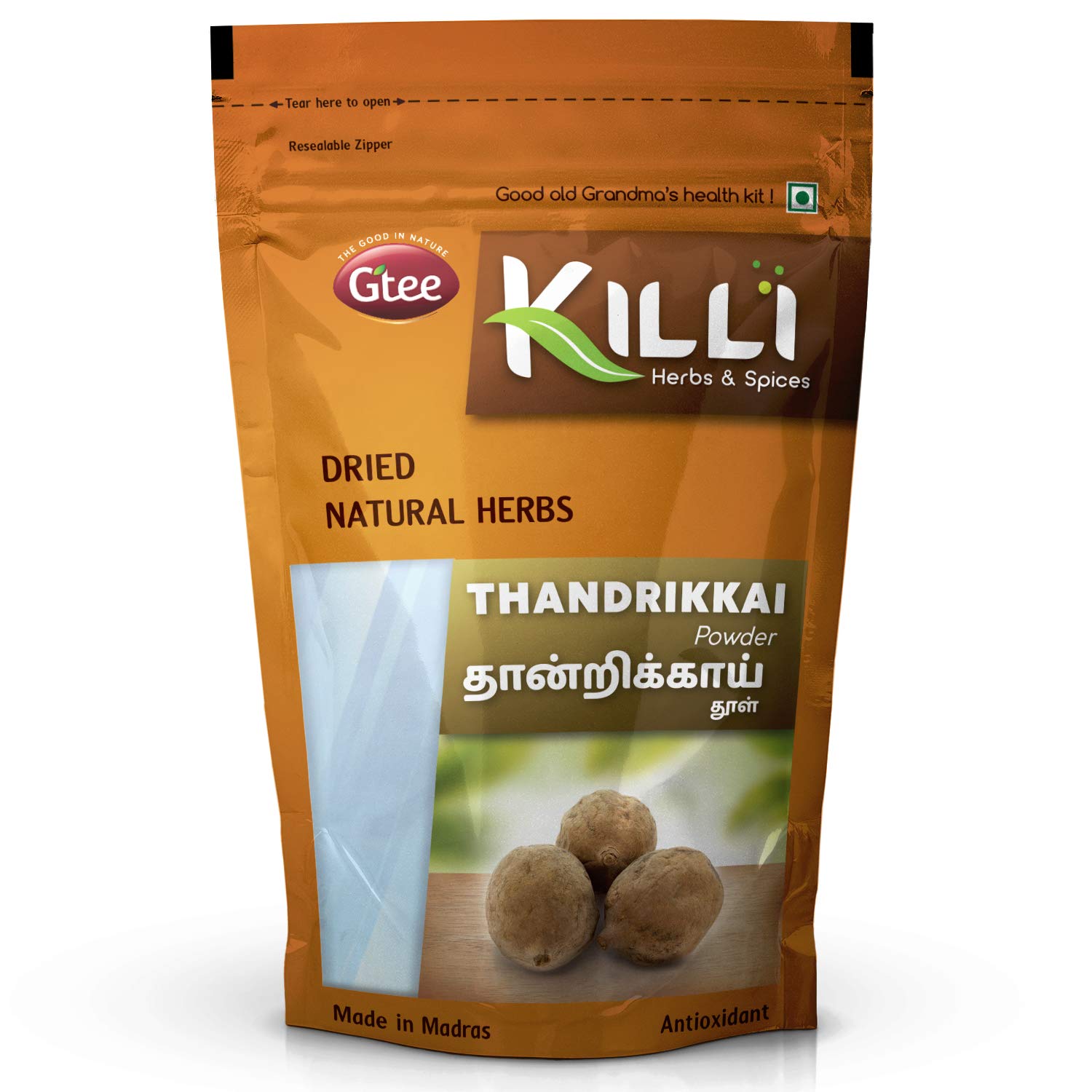 KILLI BIBHITAKI POWDERHEALTH BENEFITSBibhitaki is best known to improve immunity strengthens stomach relieve digestive issues like diarrhoea. It helps reduce cough and sore throat. Also improves dental health and aids wound healing.HOW TO MAKEMix one teaspoon (5g) of Killi Bibhitaki powder with 150ml of warm water or warm milk and drink daily. Add sufficient quantity of honey for enhanced health benefits.KILLI HERBS & SPICESKILLI having its special care and scientific approach in every stop of processing of herbs to retain the active principle taste and aroma explores the value of traditional herbs with uncompromising quality and taste to customers. We believe that the traditional wisdom is the wealth of our Nation. KILLI's unique herbal combinations offers its customers the best healthy solutions. KILLI is a Registered Trademark of Gtee