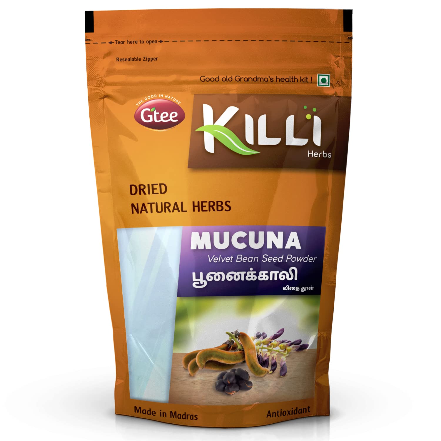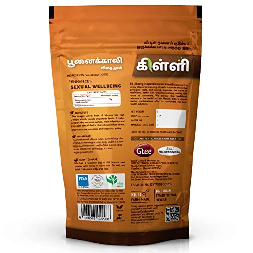 KILLI MUCUNA VELVET BEAN SEED POWDERHEALTH BENEFITSThe magic velvet bean of Mucuna has high L-dopa which boosts dopamine levels. It also helps reduce stress improves concentration and keeps you active.HOW TO MAKEMix half a teaspoon (1g) of Killi Mucuna seed powder with honey or warm milk. Stir well and drink. Take once a day after food.KILLI HERBS & SPICESKILLI having its special care and scientific approach in every stop of processing of herbs to retain the active principle taste and aroma explores the value of traditional herbs with uncompromising quality and taste to customers. We believe that the traditional wisdom is the wealth of our Nation. KILLI's unique herbal combinations offers its customers the best healthy solutions. KILLI is a Registered Trademark of Gtee