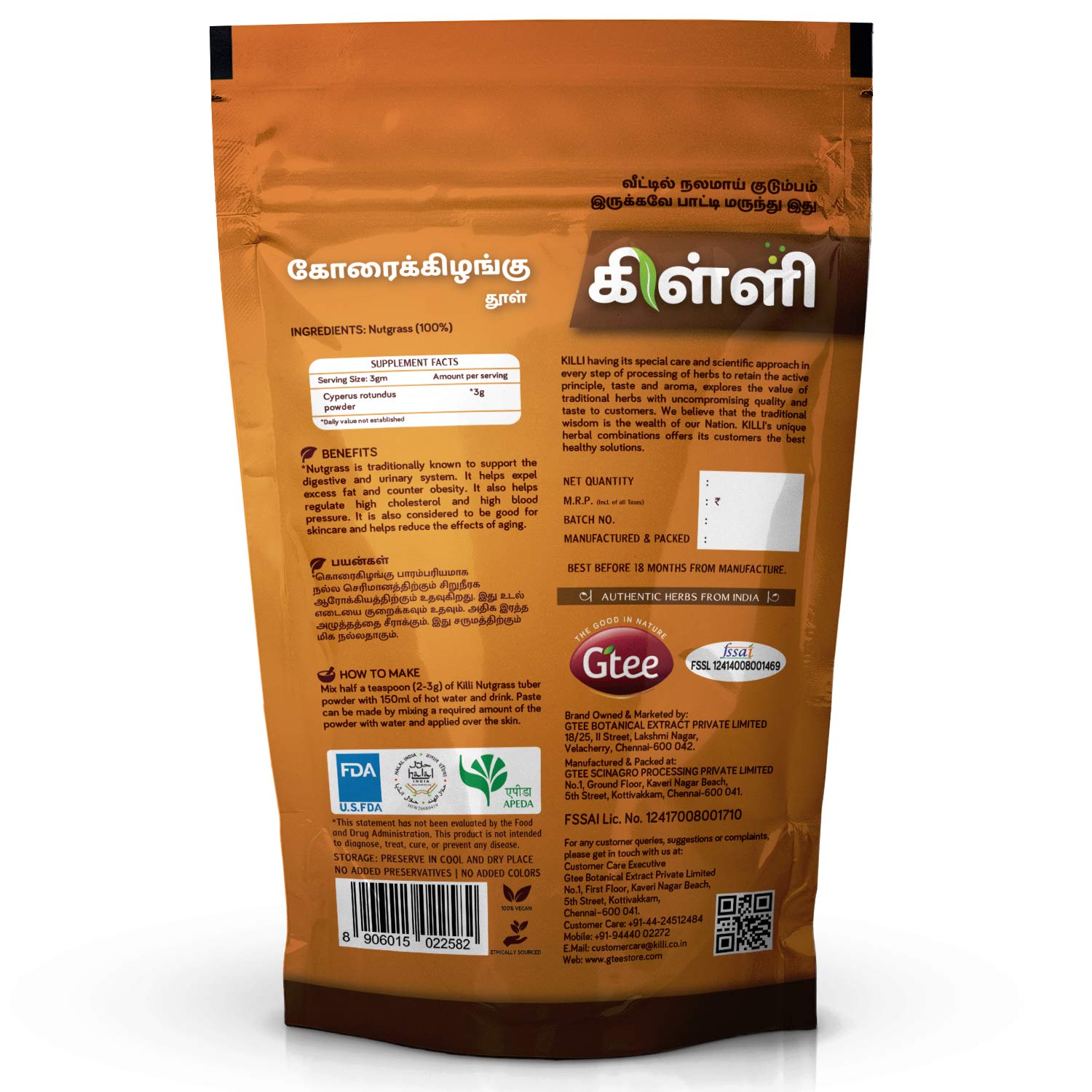 KILLI NUTGRASS TUBER POWDERHEALTH BENEFITSNutgrass is traditionally known to support the digestive system. It helps expel excess fat and counter obesity. It also helps regulate high cholesterol and high blood pressure.HOW TO MAKEMix half a teaspoon (2-3g) of Killi Nutgrass tuber powder with 150ml of hot water and drink. Paste can be made by mixing a required amount of the powder with water and applied over the skin.KILLI HERBS & SPICESKILLI having its special care and scientific approach in every stop of processing of herbs to retain the active principle taste and aroma explores the value of traditional herbs with uncompromising quality and taste to customers. We believe that the traditional wisdom is the wealth of our Nation. KILLI's unique herbal combinations offers its customers the best healthy solutions. KILLI is a Registered Trademark of Gtee