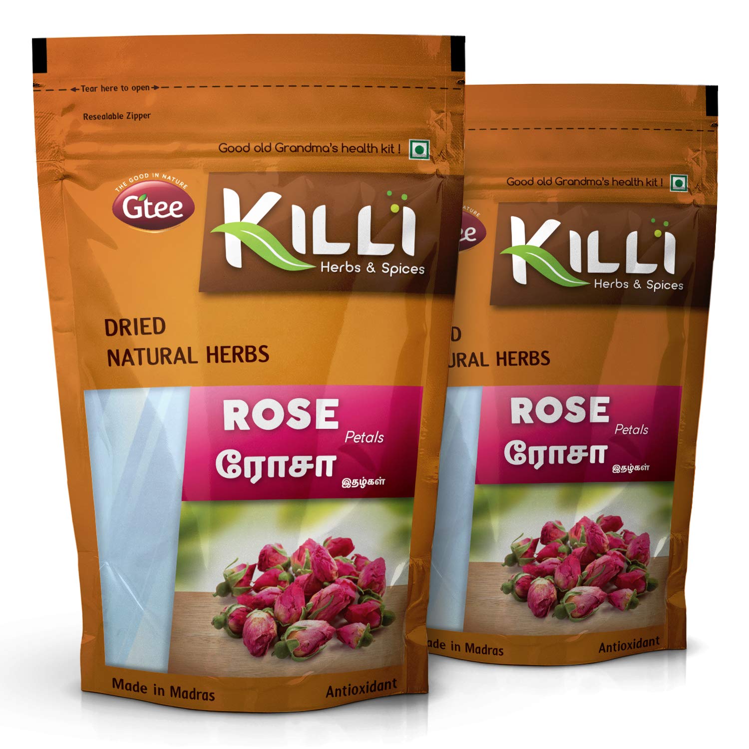 KILLI ROSE PETALSHEALTH BENEFITSRose petals gives a healthy delicious and relaxing beverage. The delicate pink flowers create a beautifully fragrant fruity and nutritious infusion rich in natural antioxidant. It helps to ease menstrual pain rejuvenate hair and skin improves digestion relieves cold aids weight loss reduces stress and improves immunity.HOW TO MAKEMix 20 to 25 Killi Rose Petals with 150ml of hot water wait for 2-3 minutes and serve. 3 to 5 drops of honey can be added to support weight loss if required.KILLI HERBS & SPICESKILLI having its special care and scientific approach in every stop of processing of herbs to retain the active principle taste and aroma explores the value of traditional herbs with uncompromising quality and taste to customers. We believe that the traditional wisdom is the wealth of our Nation. KILLI's unique herbal combinations offers its customers the best healthy solutions. KILLI is a Registered Trademark of Gtee