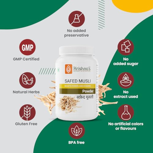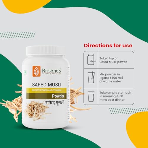 Krishna's Safed Musli Powder is a rare herb from India. It is used in traditional systems of medicine including Ayurveda Unani and homoeopathy. It has been used since ancient times for its medicinal values. The musli root contains a number of alkaloids and essential nutrients which accounts for its health benefits.