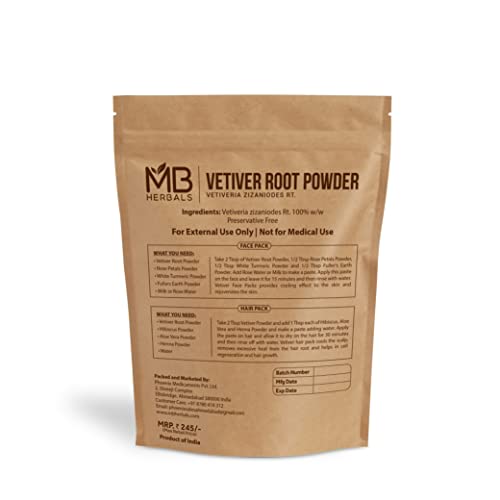 MB Herbals Vetiver Powder | Khus Root Powder | Vetiveria Zizanioides Root Powder | Ramachham FOR EXTERNAL USE ONLY | NOT FOR MEDICINAL USE Face Pack : What you need : Vetiver root powder Rose petal powder White turmeric powder Fuller's Earth Milk or Rose water. Direction of Use : Take 2 Tbsp of Vetiver Root 1/2 Tbsp Rose Petals Powder 1/2 Tbsp White Turmeric Powder and 1/2 Tbsp Fuller's Earth. Add Rose water or Milk to make a paste. Apply this paste on the face and leave it for 15 mins and then rinse with water. Vetiver Face Pack provides cooling effect to the skin and rejuvenates the skin. Hair Pack : Vetiver root powder Hibiscus powder Henna powder Aloe Vera Powder water. Direction of Use : Take 2 Tbsp of Vetiver Root and add 1 Tbsp of each of Hibiscus Powder Henna Powder Aloe Vera Powder and make a paste adding water. Apply this paste on the hair and leave it for 30 mins and then rinse with water. Vetiver Hair Pack cools the scalp removes excess heat from the hair root and helps inm cell regeneration and hair growth.