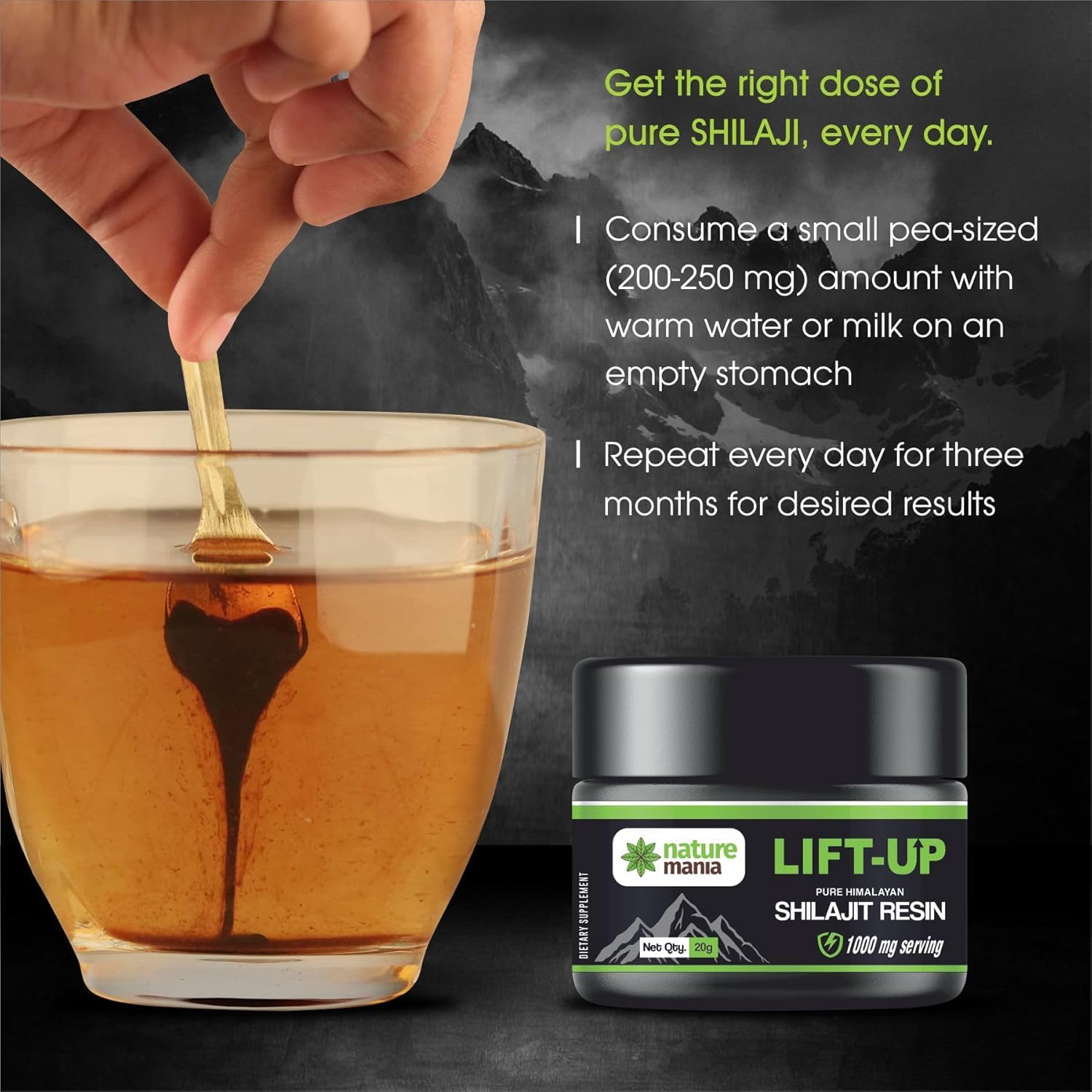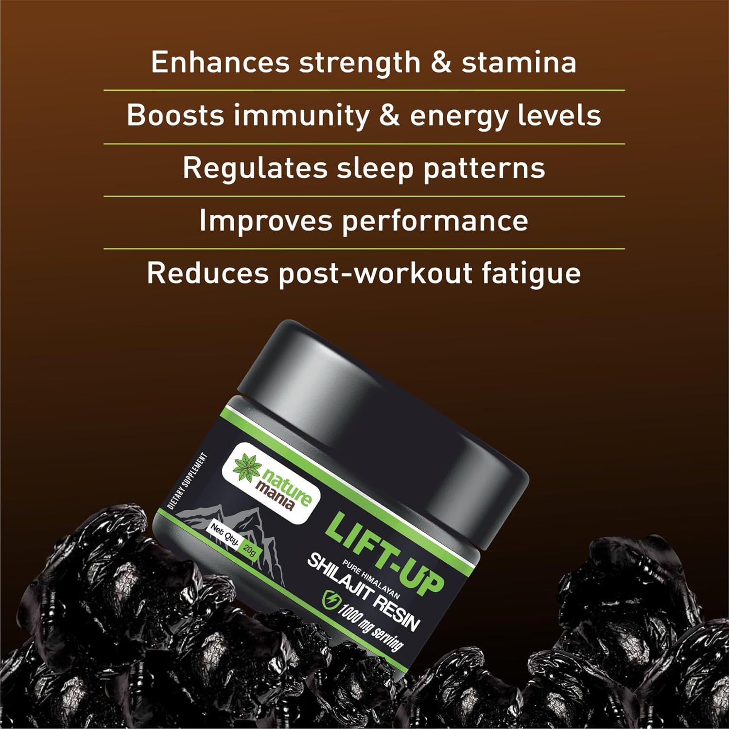Massage Oil AND Elevate your daily wellness regimen with NATURE MANIA Lift-Up Pure Himalayan Shilajit Resin. Sourced from the serene altitudes of the Himalayas this premium supplement is designed to boost your vitality stamina and immune health. Embrace the power of nature with this ancient remedy now available in its purest form to support your modern lifestyle. Our shilajit resin is not just any supplement; it's a holistic approach to enhancing your physical and mental performance. With its rich content of essential minerals and fulvic acid it provides a sustained energy boost improving focus and endurance. Ideal for the active individual whether you're a professional athlete or fitness enthusiast it's your daily dose of natural vigor. But our commitment goes beyond just vitality. NATURE MANIA Lift-Up also supports your immune system. Its antioxidant properties help fend off oxidative stress promoting a strong and responsive immune system. Experience a natural shield against daily stressors keeping you healthy and active. We take pride in our ethical sourcing and sustainability practices. Our shilajit resin is harvested with respect for the natural environment ensuring that you receive a product that's not only effective but also responsible.