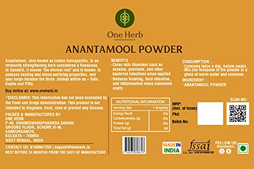 One Herb - Anantmool Powder 100g (Indian Sarsaparilla) for Full Body Cleanse Skin Care and Detoxific