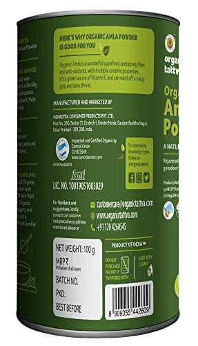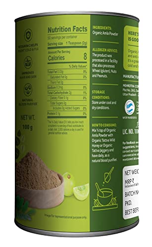 Organic Tattva's Organic Amla Powder (India Gooseberry) is a great source of vitamin c calcium and Iron. Along with these Organic Amla Powder also contains dietary fibers potassium and various other nutrients. One teaspoon (2g) of Organic Amla Powder has 0g trans-fat and 0mg cholesterol. The calorie count per serving (2g) of Organic Amla Powder is 8. Switch to Organic Amla Powder by Organic Tattva for a healthier you. You must have heard this phrase before âBitter is betterâ. Isn't this what we have heard our grandparents say? Eat more bitter gourd kale sprouts and radishes as they are packed with abundant health benefits. Well have you heard of another such superfood Amla or Indian Gooseberry? Amla is a green colored translucent fruit which derives its name from the Sanskrit word âAmlaki' which means ânectar of lifeâ. Amla is famous in India for its many health benefits and its quality to handle countless ailments. As per Ayurveda amla can balance the three doshas in our body namely: Kapha Vata Pitta thereby eliminating the underlying cause of many health problems. It has eight times more vitamin C than an orange twice the antioxidant power of acai berry and around 17 times that of a pomegranate. The humble Indian gooseberry commonly known as amla truly deserves its superfood status. Being a very rich source of Vitamin C iron and calcium amla is a health treasure. It also offers a number of beauty benefits for your hair and skin. Amla is a very special fruit full of antioxidants that are effective in fighting with free radicals reason of cell damage. One of the best ways to have amla is in the powdered form. Since amla powder is a bit bitter tasting you can drink a mix of amla powder ginger powder honey and lime juice or you can even add amla powder to a glass of fresh juice for breakfast. You can also sprinkle some amla powder on fruits such as banana apple or papaya and have as a mid-meal snack.