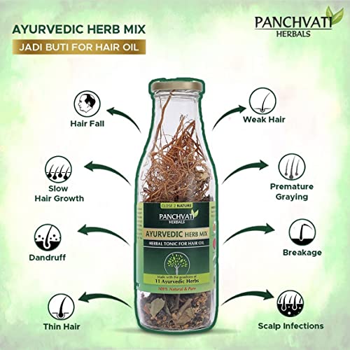 • FROM THE LAP OF AYURVEDA : Panchvati Jadi Buti Mix (For hair oil) is an Indian Ayurvedic concept which effectively tackles all hair related issues naturally. When applied as directed it effectively reduces hair fall fights dandruff adds shine promotes hai