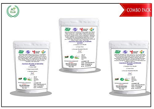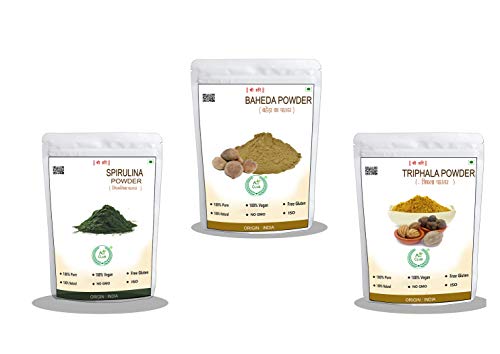 Spirulina Powder + Triphala Powder + Bhedha Powder is a traditional ayurvedic herbal formulation consisting of three fruits:AmalakiBibhitaki and Haritaki.Triphala is popular for its unique ability toently cleanse and detoxify the system while simultaneously replenishing and nourishing it.