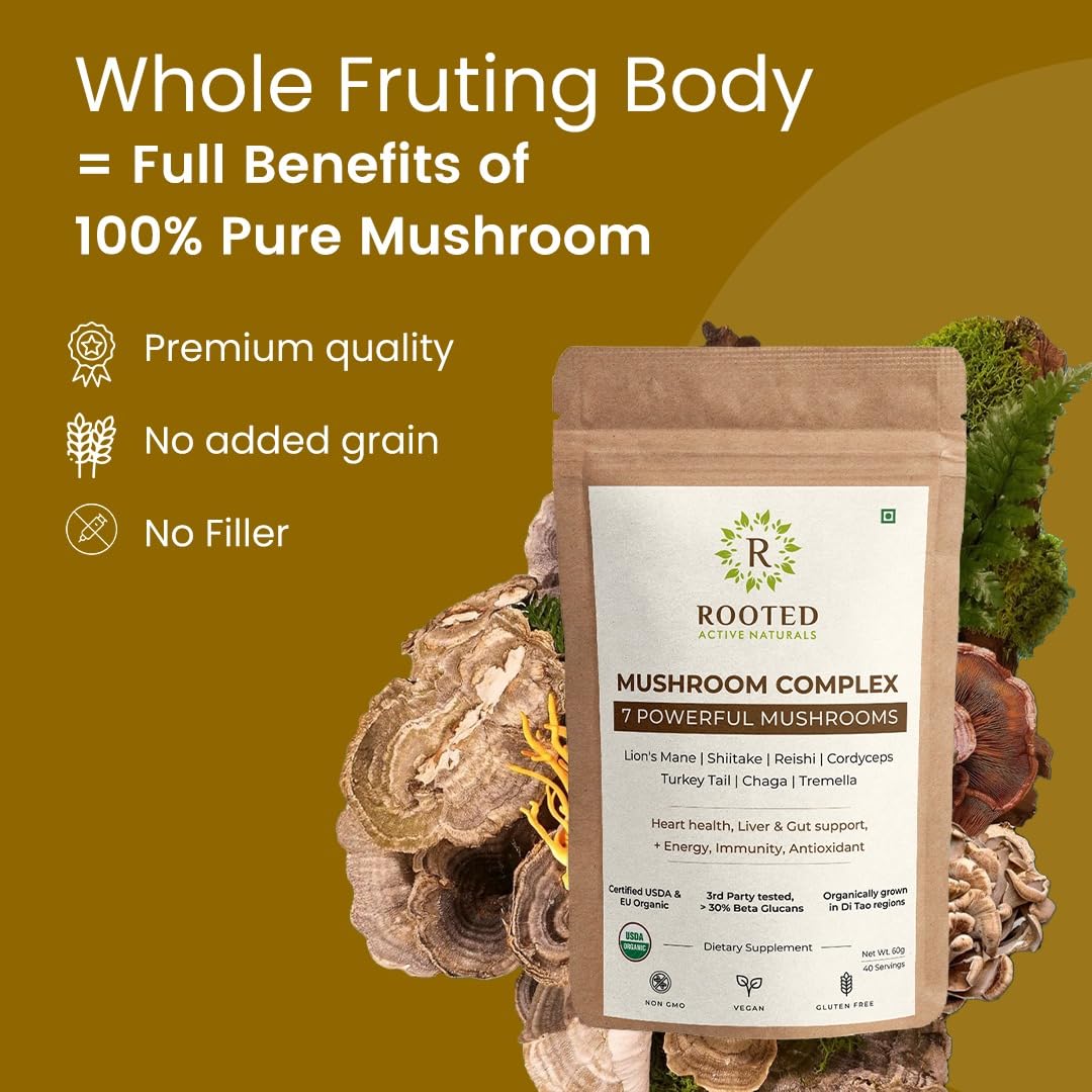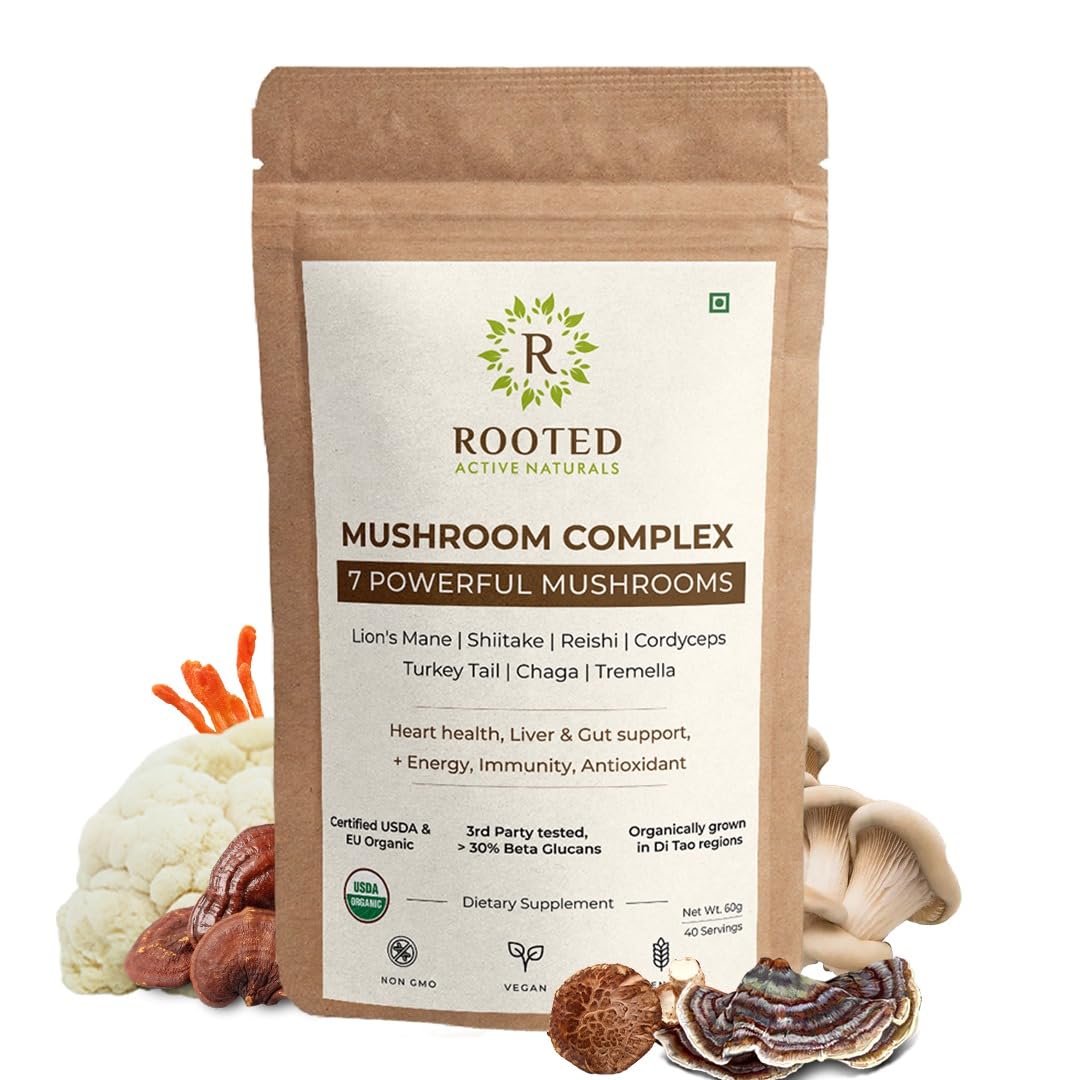 Rooted Actives 7 Mushrooms Complex (60 g) extract powder | for Heart Liver Gut Energy & Immunity (USDA organic 30% Beta Glucans
