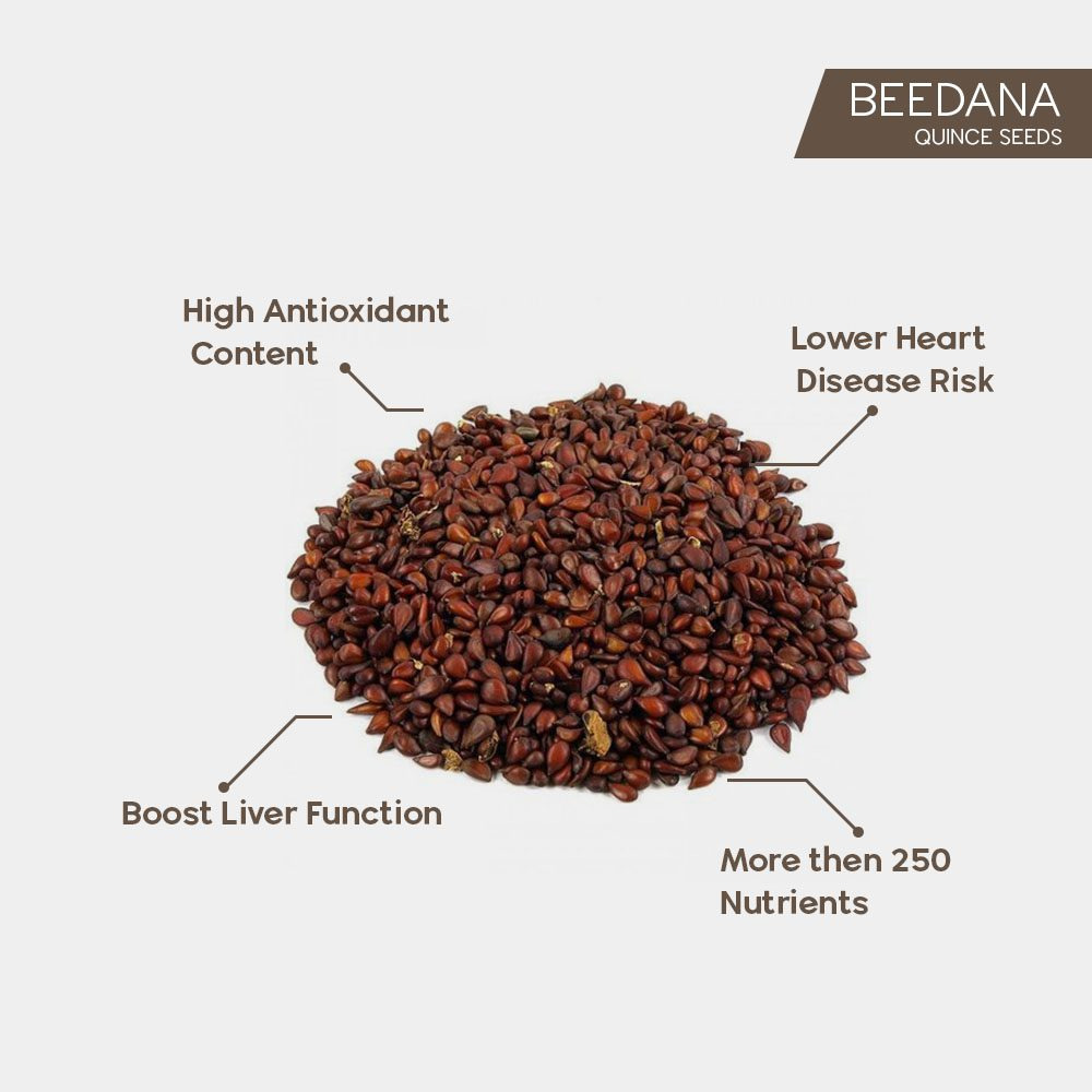 Beedana are tiny, oval-shaped seeds that are produced by the quince fruit, a native of Western Asia deciduous tree. The seeds' soft, white inner kernel is enclosed in a hard, brown outer shell.