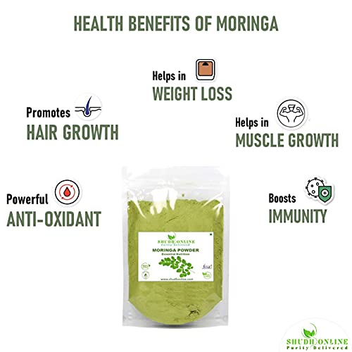 Organic Moringa Leaves Powder by Shudh Online is a superfood dietary supplement. Adding Moringa Powder to your lifestyle is as simple as adding a scoop to your favorite smoothie recipe. Moringa Leaf Powder is in rich in nutrients. Two small portions per day is all you need. Other names - Moringa oleifera Moringa Leaves Powder Organic Murunga Ilai Muringa Ela Mulaga Akulu Nugge Yele Saijan Patta Sajna Sag Muringakkai Munnakaya Saragavo Munagakayalu Mulaku Kada Munaga Shevaga Pan Munagaku Murungai Leaf powder Muringayila Moringo Morigana Muringa Horseradish Drumstick small Deciduous The Miracle Tree Ben Oil Shudh Online products are selectively sourced with great emphasis on purity and authenticity and are 100% natural ayurvedic products. We don't add any preservatives or additives in the product and using our product will get you closure to nature.