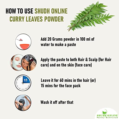 Shudh Online Curry leaves moisturize the scalp while getting rid of dead hair follicles . They are a good source of proteins and beta-carotene both of which prevent hair loss and thinning . The leaves are also rich in amino acids that help strengthen follicles and keep them healthy . How to make curry leaves hair pack 1. Boil coconut oil with curry leaves powder for acting As A Hair Tonic. 2. Curry leave powder with yogurt As A Hair Mask. It is also known as curry leaves fresh curry leaf powder forest herbs kari leaves karuveppilai powder kadi patta. Shudh Online products are selectively sourced with great emphasis on purity and authenticity and are 100% natural ayurvedic products. We don't add any preservatives or additives in the product and using our product will get you closure to nature.