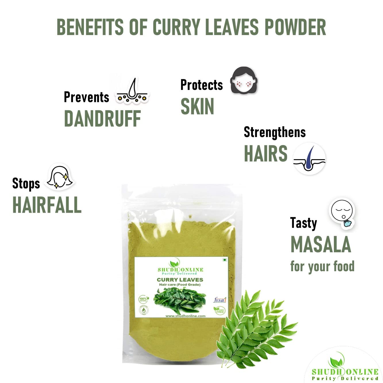 Shudh Online Curry leaves moisturize the scalp while getting rid of dead hair follicles . They are a good source of proteins and beta-carotene both of which prevent hair and thinning . The leaves are also rich in amino acids that help strengthen follicles and keep them healthy . How to make curry leaves hair pack 1. Boil coconut oil with curry leaves powder for acting As A Hair Tonic. 2. Curry leave powder with yogurt As A Hair . It is also known as curry leaves fresh curry leaf powder forest herbs kari leaves karuveppilai powder kadi patta. Shudh Online products are selectively sourced with great emphasis on purity and authenticity and are 100% natural ayurvedic products. We don't add any or additives in the product and using our product will get you closure to nature.