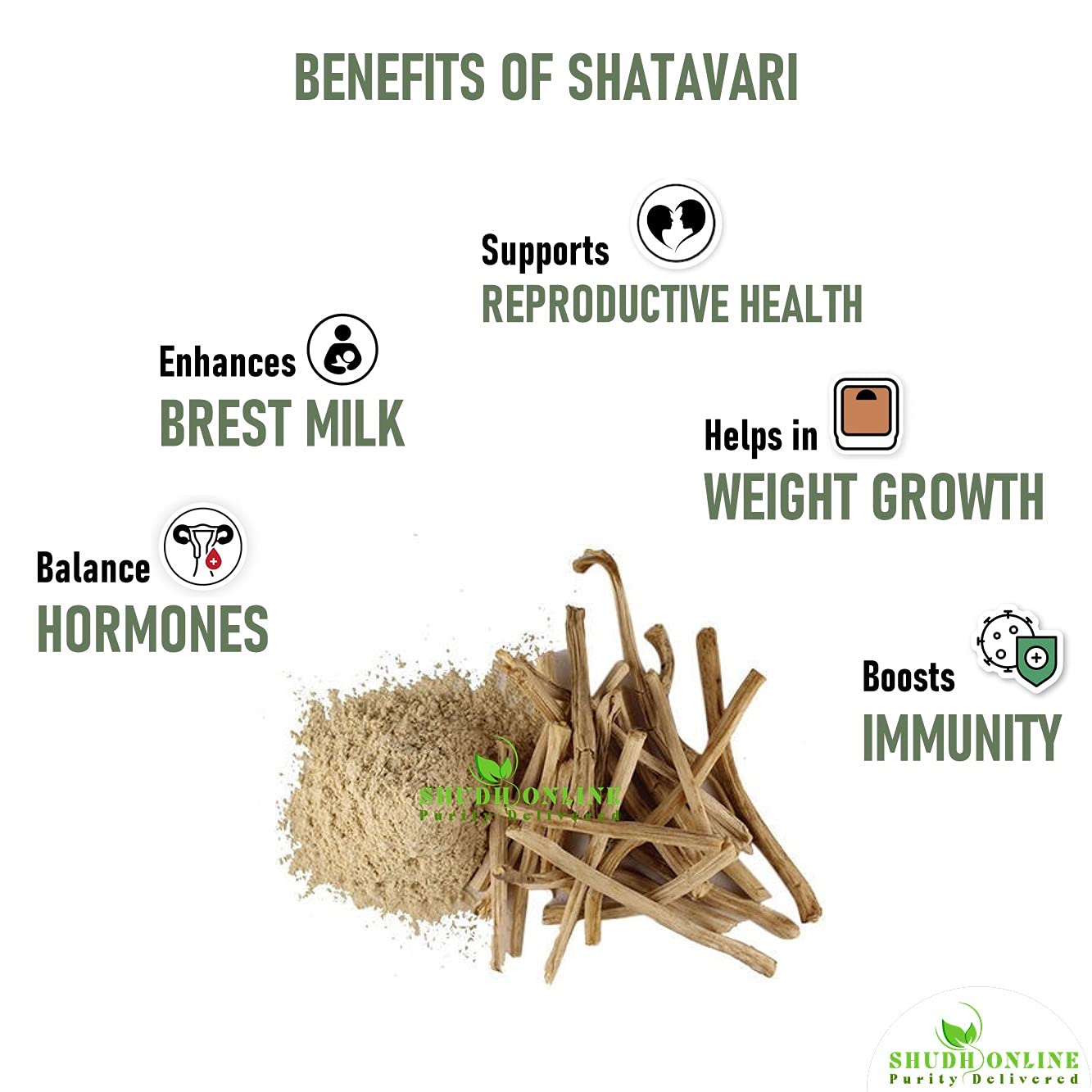 Shudh Online Shatavari powder supports health by toning and nourishing the female organs. Shatavari is also especially useful in nourishing and calming the body. Other names - Wild Asparagus Asparagus Root Shatavar Shatamuli Shatavarmul Shatavali Kilwari Shatapadi Satamuli Aheruballi Chatavali Kairuwa Narbodh Norkanto Satavari Satawar Satawari Satmooli Satmuli Shatamuli Shatavari Shatmuli Shimaishadavari Sitawari Shudh Online products are selectively sourced with great emphasis on purity and authenticity and are 100% natural ayurvedic products. We don't add any or additives in the product and using our product will get you closure to nature.