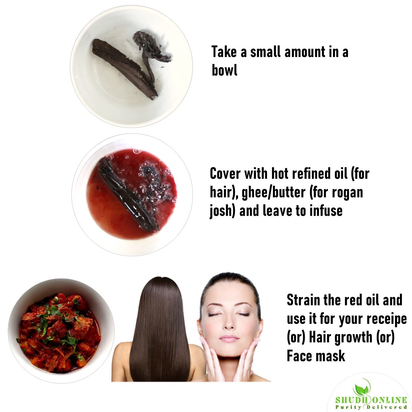 Shudh Online Alkanet root better known as Ratan jot / Ratan Joth is traditionally used to add color to Indian food. It is the original natural food coloring that gives the famous Kashmiri dish rogan josh its signature red color. ly these days artificial food colors have replaced ratan jot in tandoori chicken and the traditional Kashmiri rogan josh has been butchered with the use of tomatoes. It is also known as Ratan joot Onosma Orchanet Alkanna Tinctoria Vembalam Pattai Alkanet vempalaá¹ paá¹á¹Äyi vembaalam pattee Vembalaá¹ paá¹á¹Äyi Laljari Vembalam pattai Baal Jad Buge Azuree Yatilung Laljari Maharanga Thavittu vembala Dyerâs bugSpanish BugLaedoc Bug. Shudh Online products are selectively sourced with great emphasis on purity and authenticity and are 100% natural ayurvedic products. We don't add any or additives in the product and using our product will get you closure to nature.