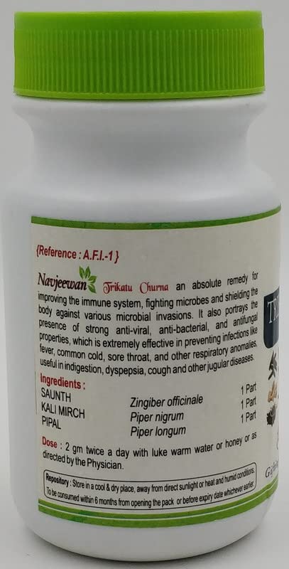 Navjeewan's ‘TRIKATU CHURNA’ - the potent PUNGENT Herbal mix that has literally been tagged as a ‘Panacea’ for most health irregularities. Stimulative in nature is good optimum functioning of Spleen Liver & Pancreas in body. Stimulates Digestive enzymes. for good digestion Good for Respiratory system Protects liver from liver damage increases body immunity Ingredients: 1 part Pippali / Long pepper - Piper longum 1 part Kali Marich / Black pepper – Piper nigrum 1 part Shunthi/ Adrak/ Ginger – Zingiber officinalis Dry all the herbal ingredients separately till there is no moisture remaining. Put them together in a blender and make a powder of it. Now again keep the powder under direct sunlight to remove the presence of moisture.