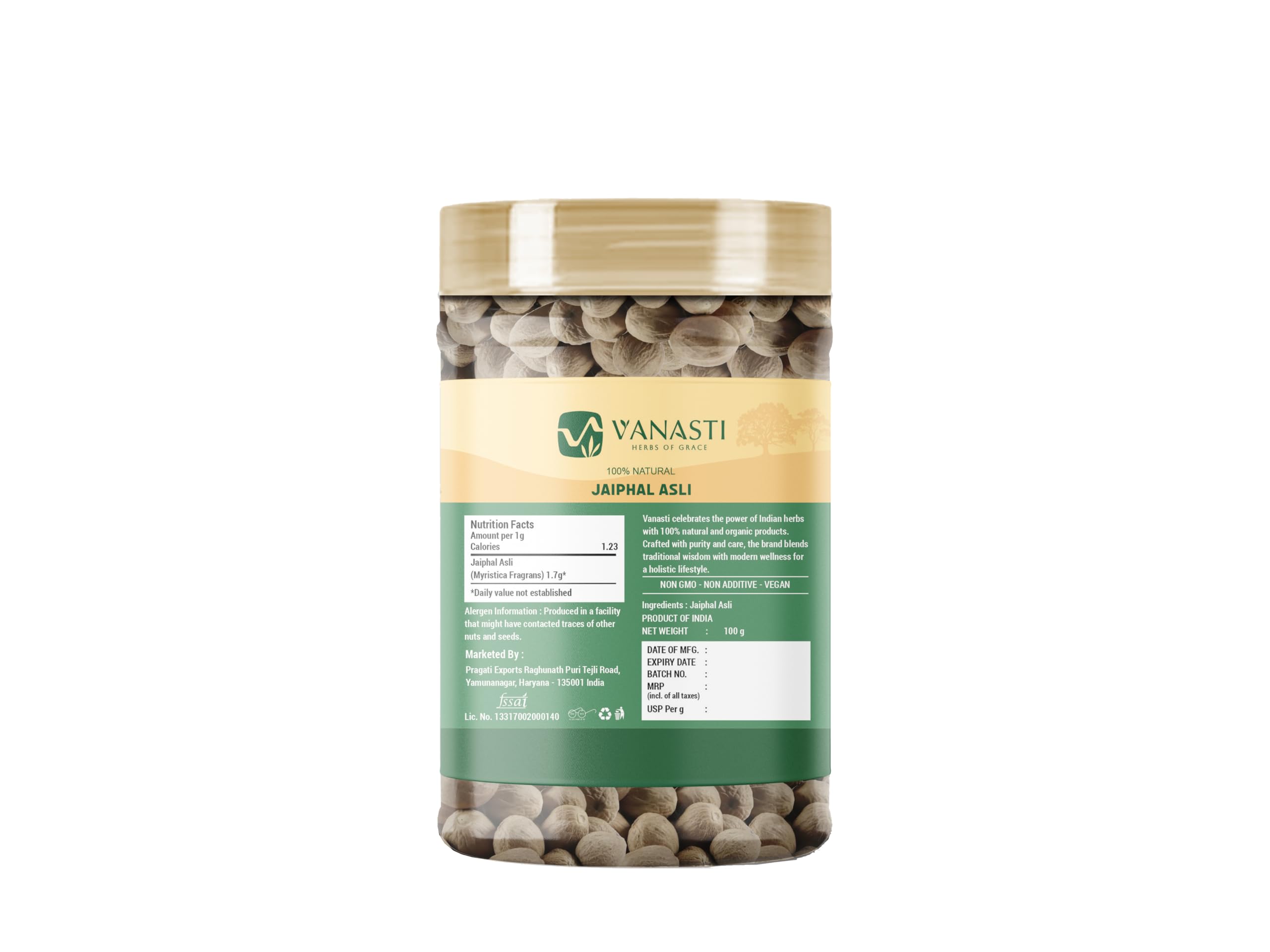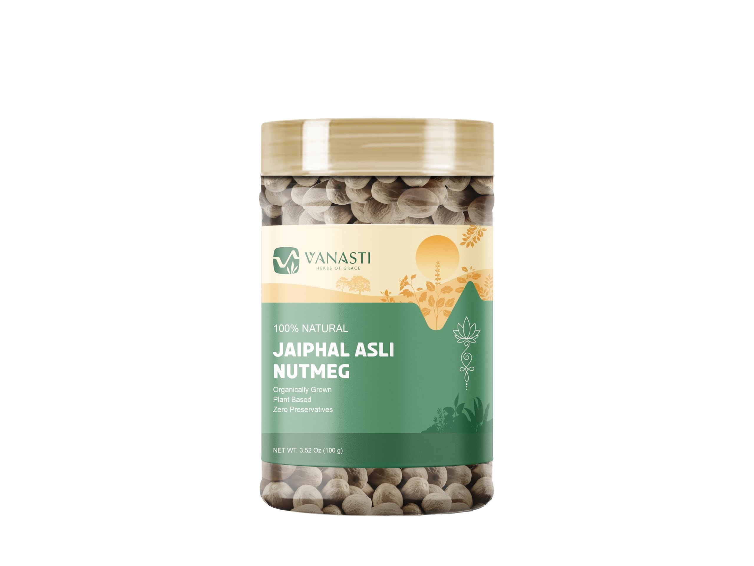 Jaiphal Asli (Nutmeg) is the dried seed of the Myristica fragrans tree, native to Indonesias Maluku Islands. Enclosed in a yellow fruit, the brown nutmeg seed is aromatic and slightly oily, with a warm, spicy flavor. Common in global kitchens, its used ground or whole in cooking, as well as in scented products like soaps and oils.