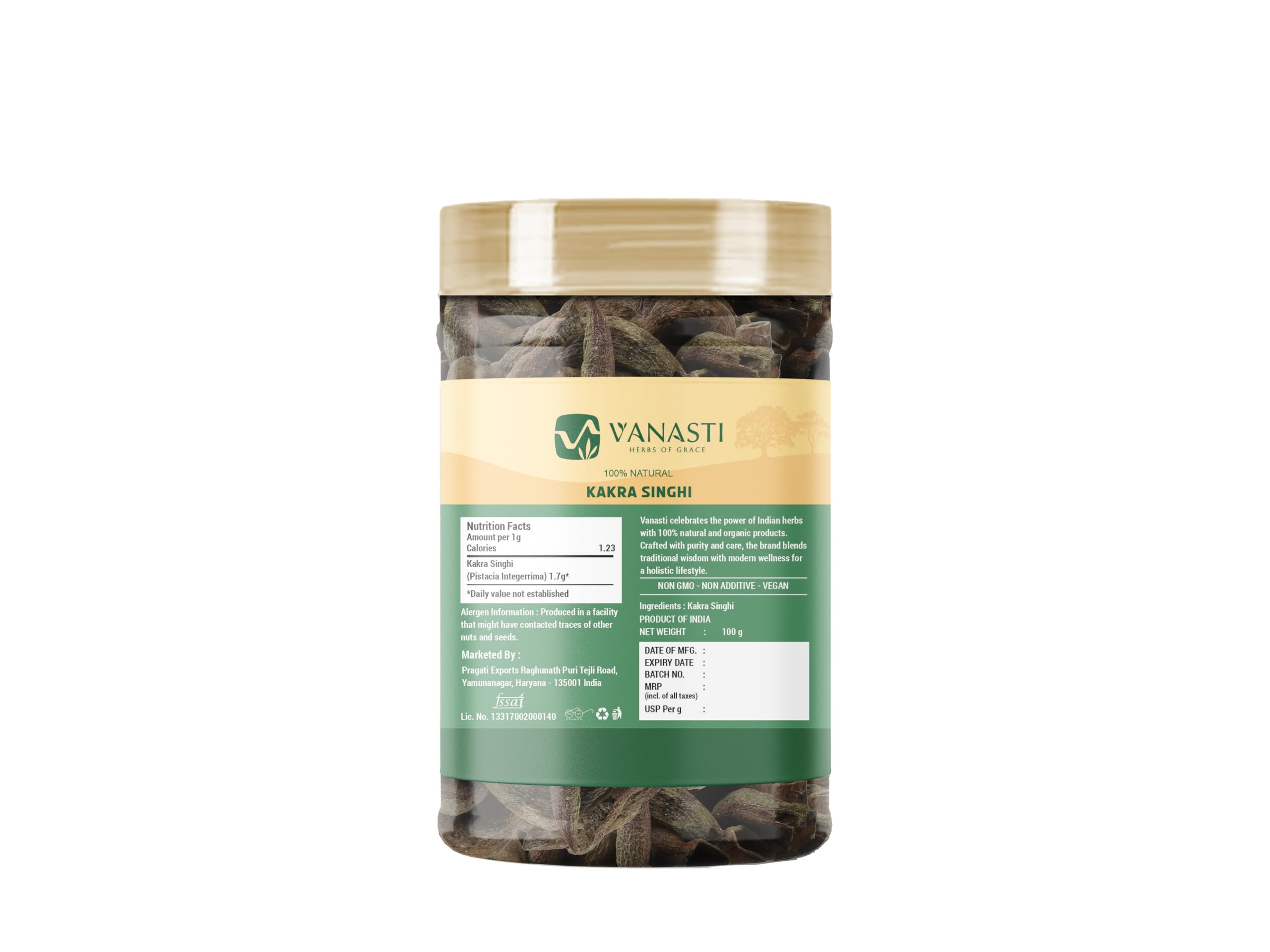 Kakra Singhi (also known as Karkatshringi or Pistacia integerrima) is the dried gall of a small tree native to the Himalayan foothills. The galls are hard, cone-shaped, and brownish, containing natural plant compounds such as flavonoids, tannins, alkaloids, and terpenoids. Kakra Singhi is naturally rich in fiber and small amounts of vitamin C. It is commonly used as a botanical ingredient in herbal blends and culinary preparations, valued for its distinctive aroma and mildly astringent taste.