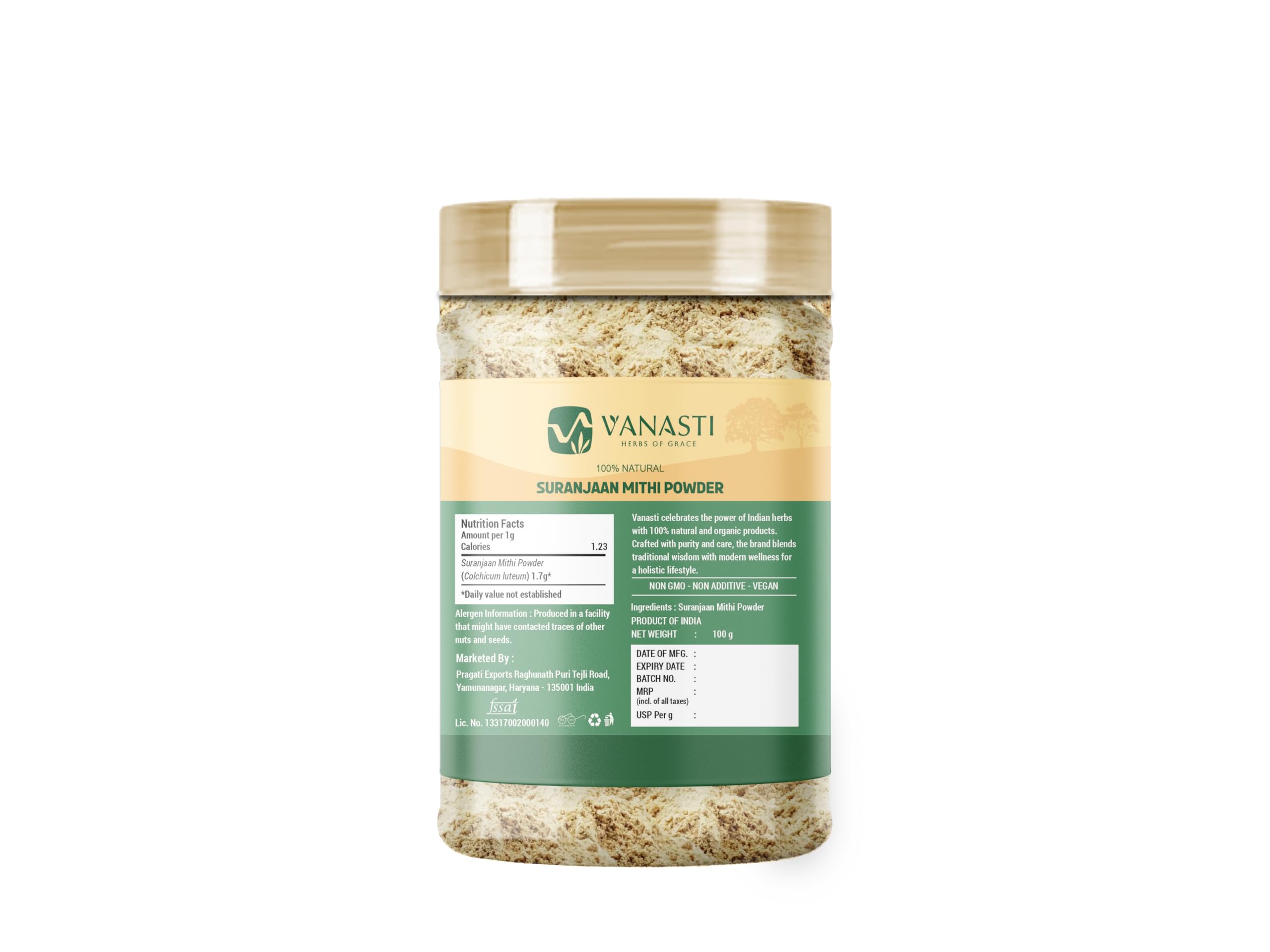 Suranjaan Mithi Powder is made from the dried flowers of Colchicum luteum, a rare plant found in Central Asias highlands.The powder has a smooth, fine texture and a faint, earthy scent.Its soft beige hue and delicate composition make it visually appealing.Used in select natural mixtures, it offers subtle plant-based character. Its alpine origin and refined form set it apart from common herbal powders. Suranjaan Mithi Powder is chosen for its distinctive botanical profile.