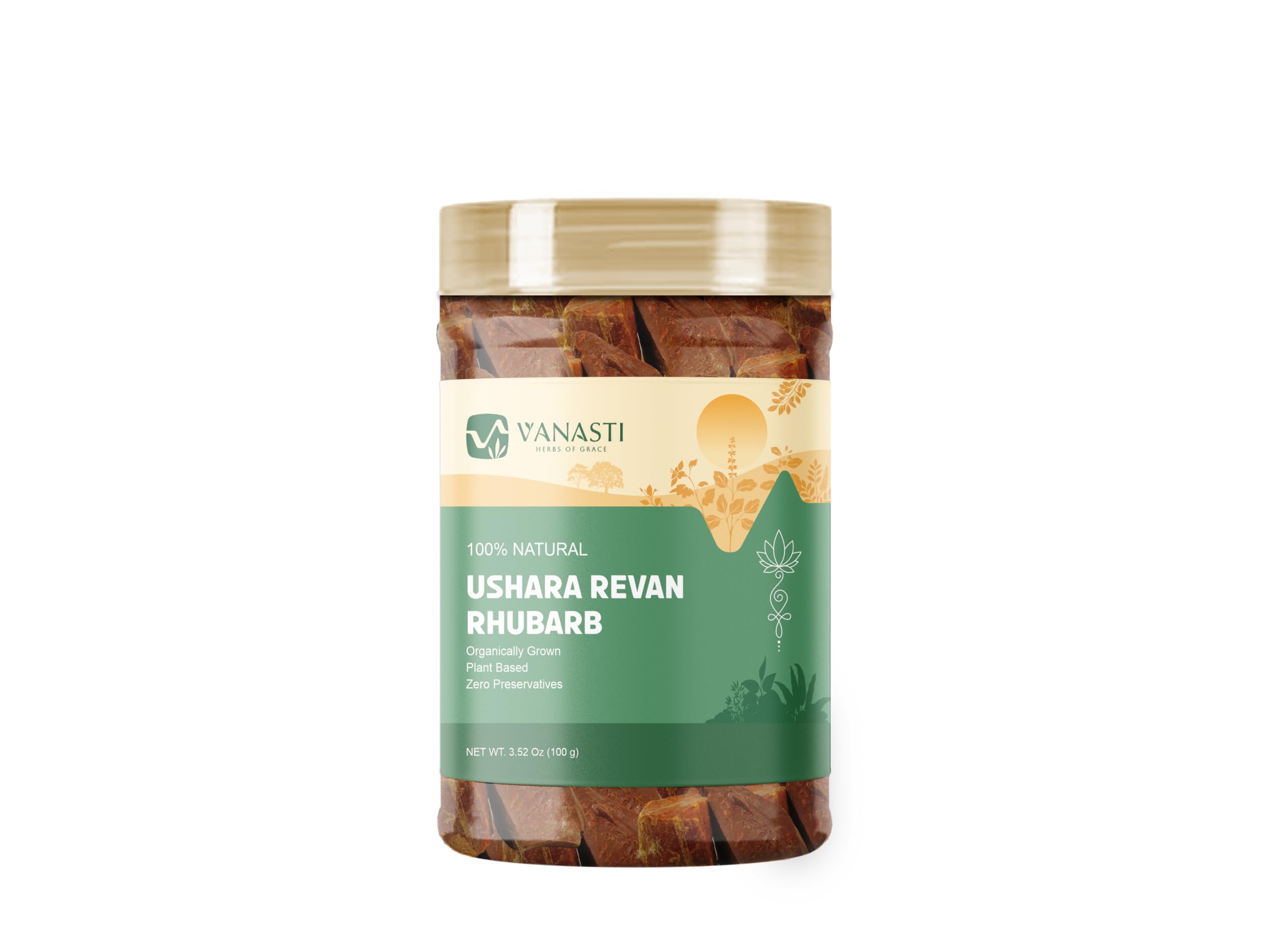 Ushara Revan, also known as Rheum emodi or Indian rhubarb, is a mountain plant native to the Himalayan regions. It features thick, fleshy roots and large green leaves with reddish stems. The roots are often dried and ground into powder or extract form. Indian rhubarb is known for its earthy taste and is sometimes added to herbal mixtures. It contains trace minerals such as calcium and iron. This plant is valued mainly for its bold flavor and natural composition.