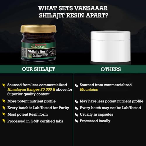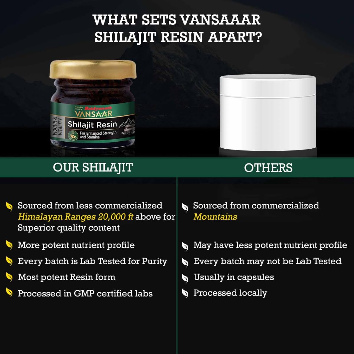 • ORIGINAL SHILAJIT sourced from 20000 ft. above: Vansaar Shilajit Resin is sourced from Himalayan ranges 20000 ft above that undergoes Ayurvedic Shodhana process to provide you with Pure Shilajit which is naturally rich in fulvic acid and other actives. Ou