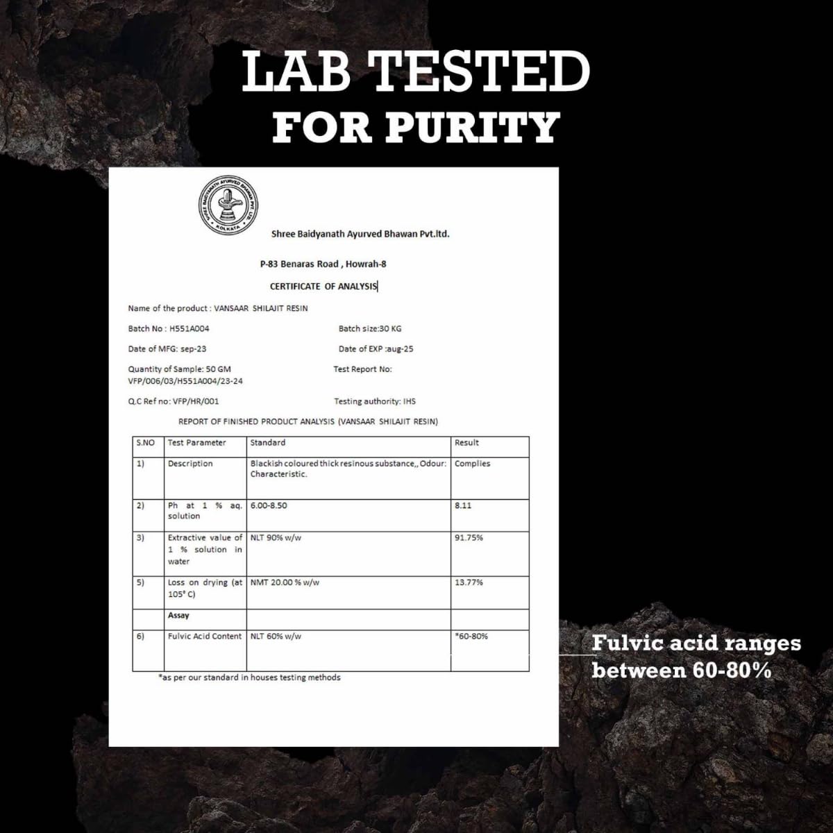 • RICH IN FULVIC ACID: Our Shilajit has guaranteed upto 80% Fulvic acid content to aid in enhanced strength & stamina.