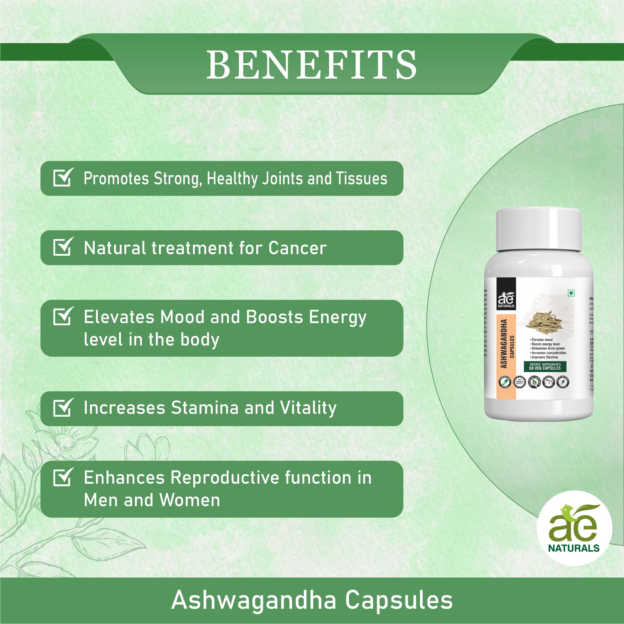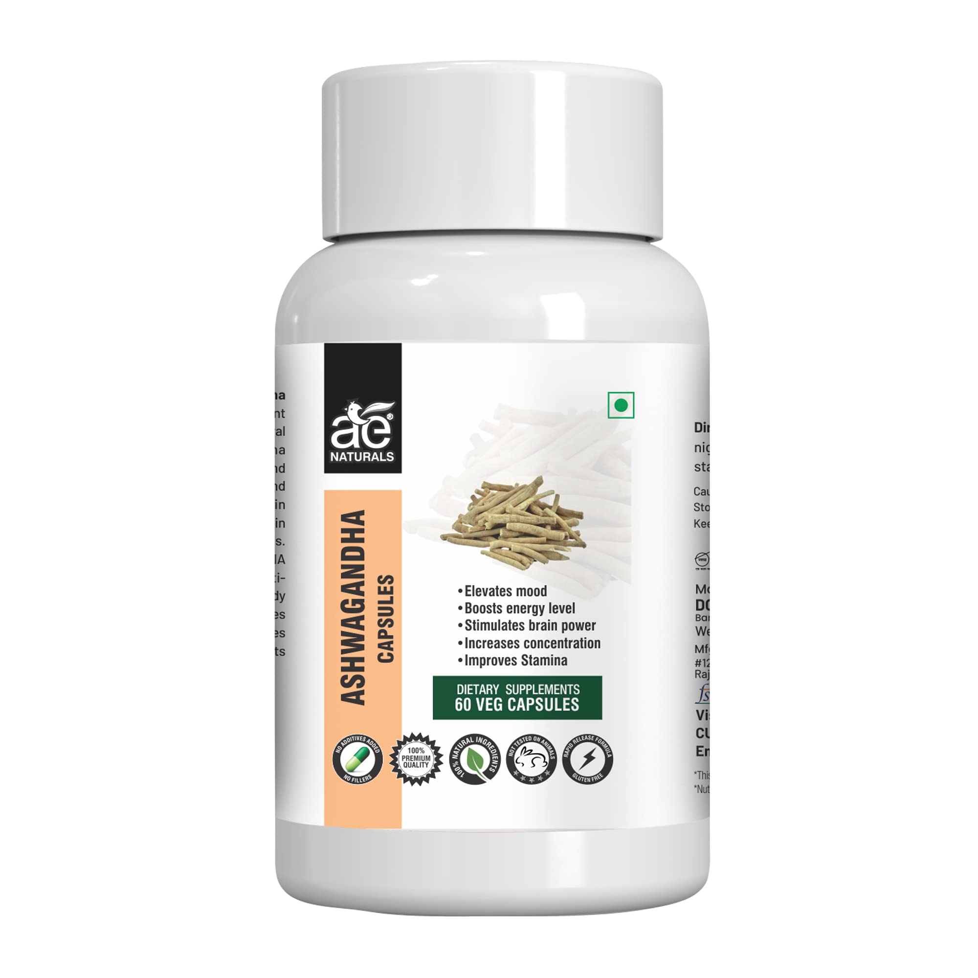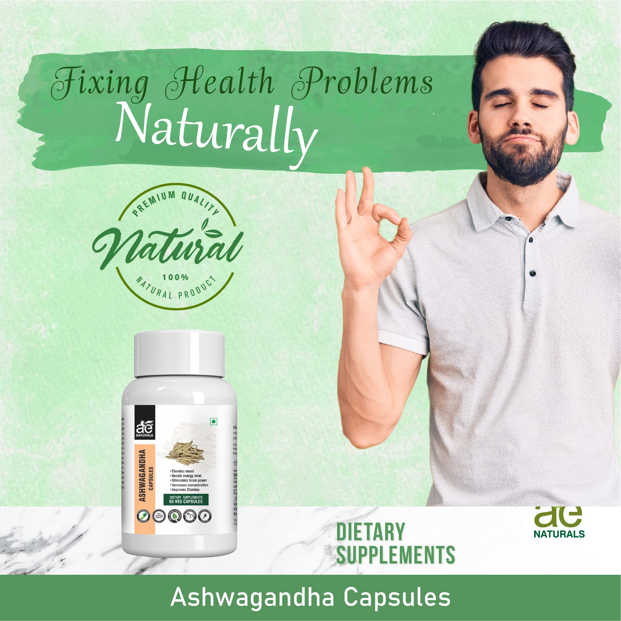 AE Naturals Organic Ashwagandha Capsules 60 Caps Vegan Superfood for Stress Relief Immunity & Strength Boost Herbal Protein Height Growth Boosted Stamina & Mental Calmness | Support for Stress Anxiety Issues and Overall Well-being (Pack of 1)