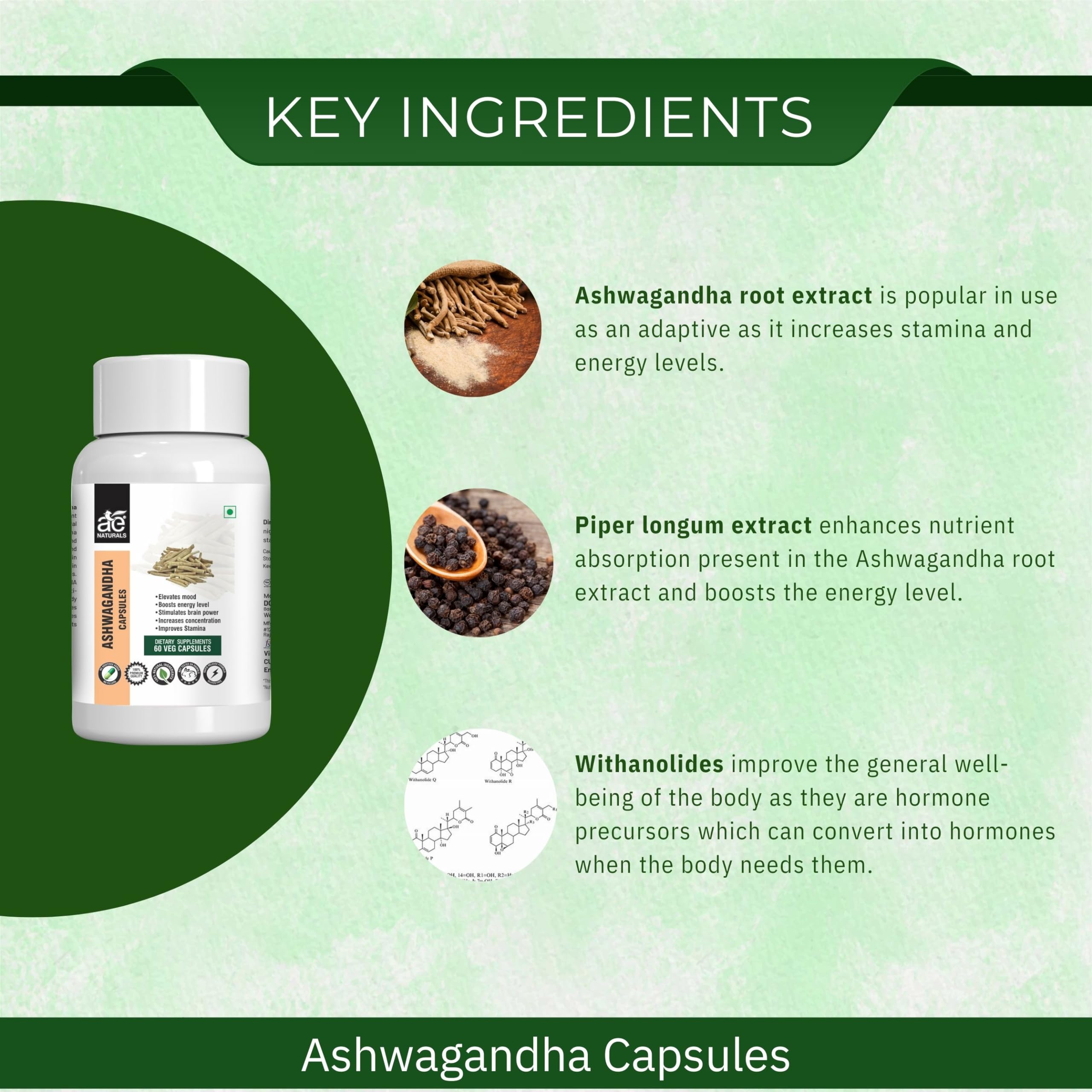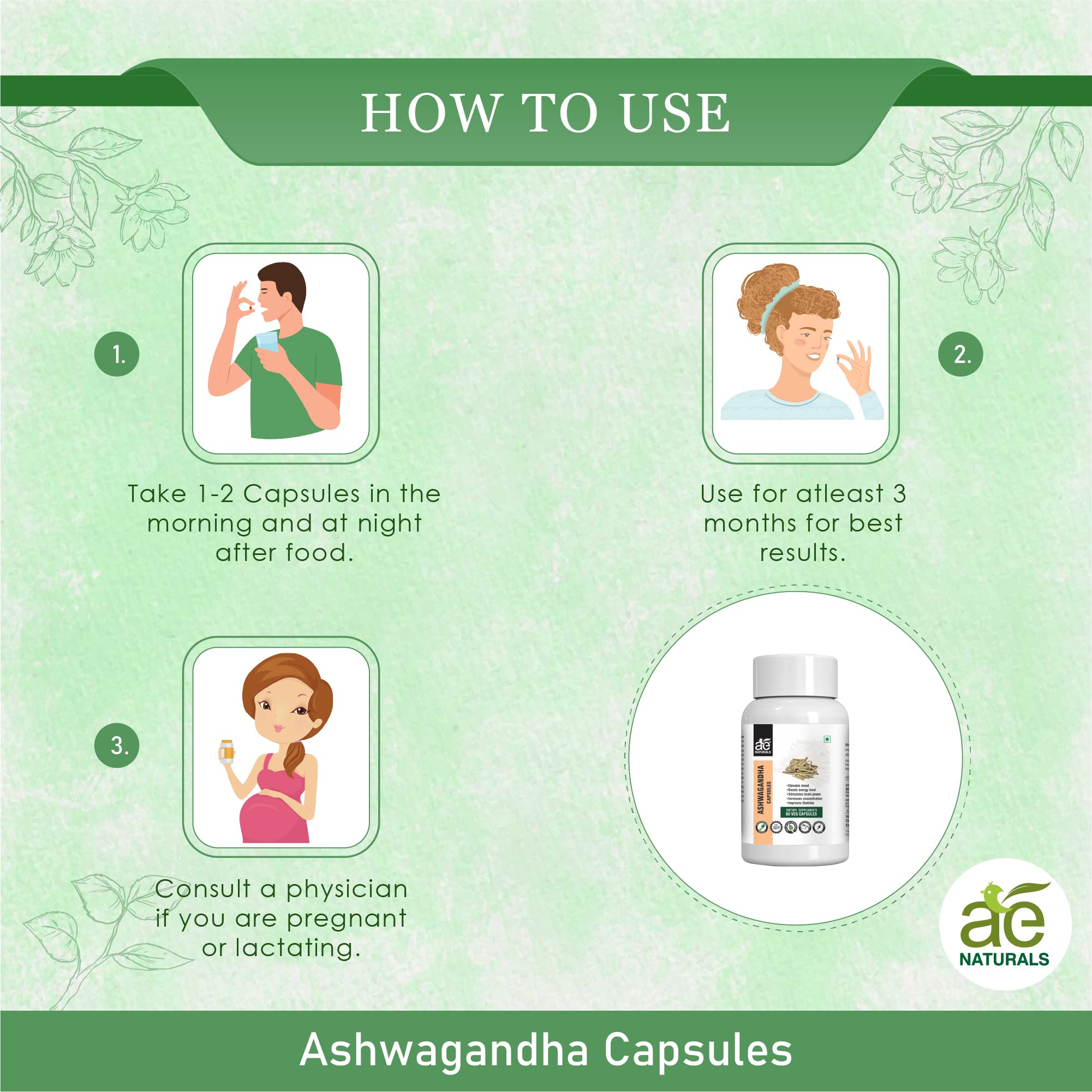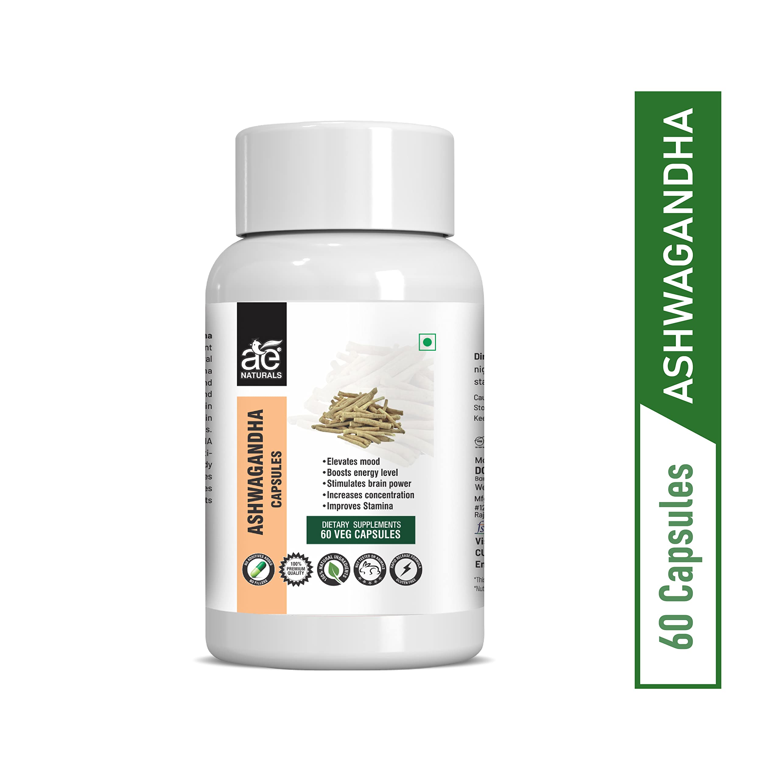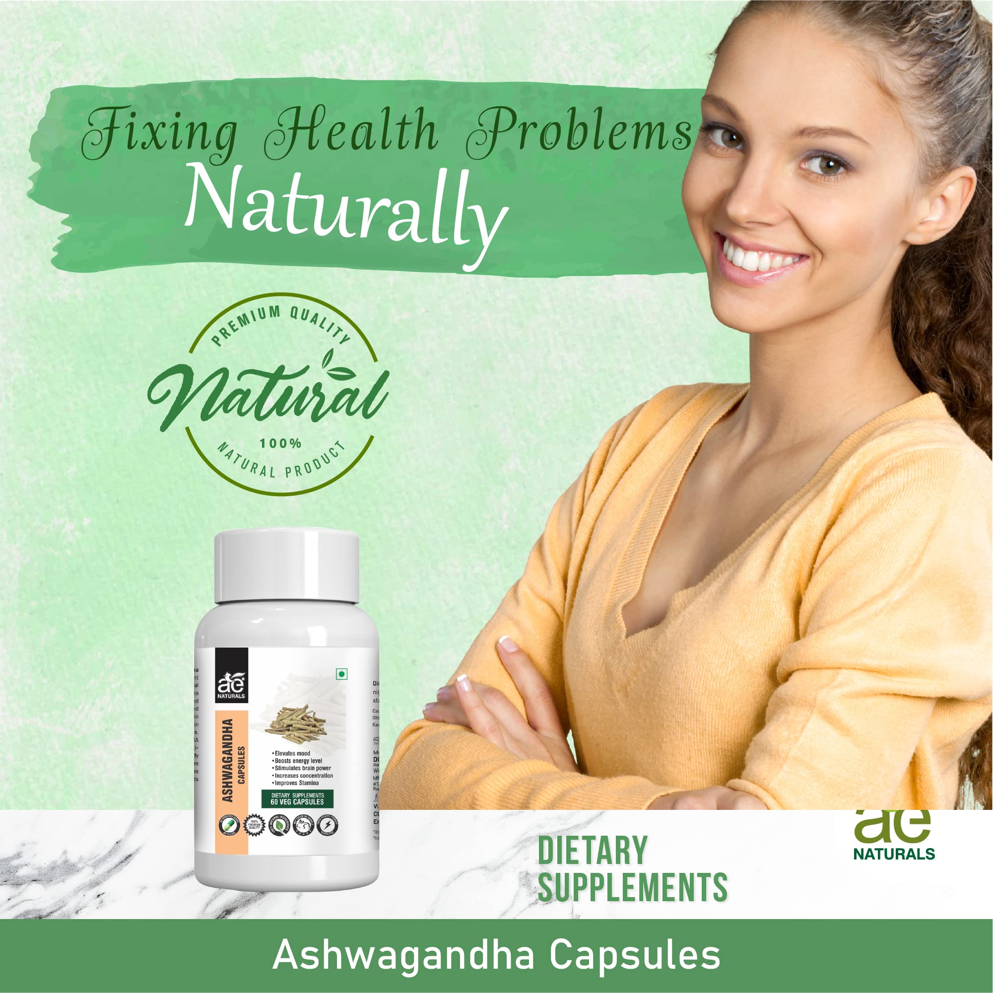 AE Naturals Organic Ashwagandha Capsules 60 Caps Vegan Superfood for Stress Relief Immunity & Strength Boost Herbal Protein Height Growth Boosted Stamina & Mental Calmness | Support for Stress Anxiety Issues and Overall Well-being (Pack of 1)
